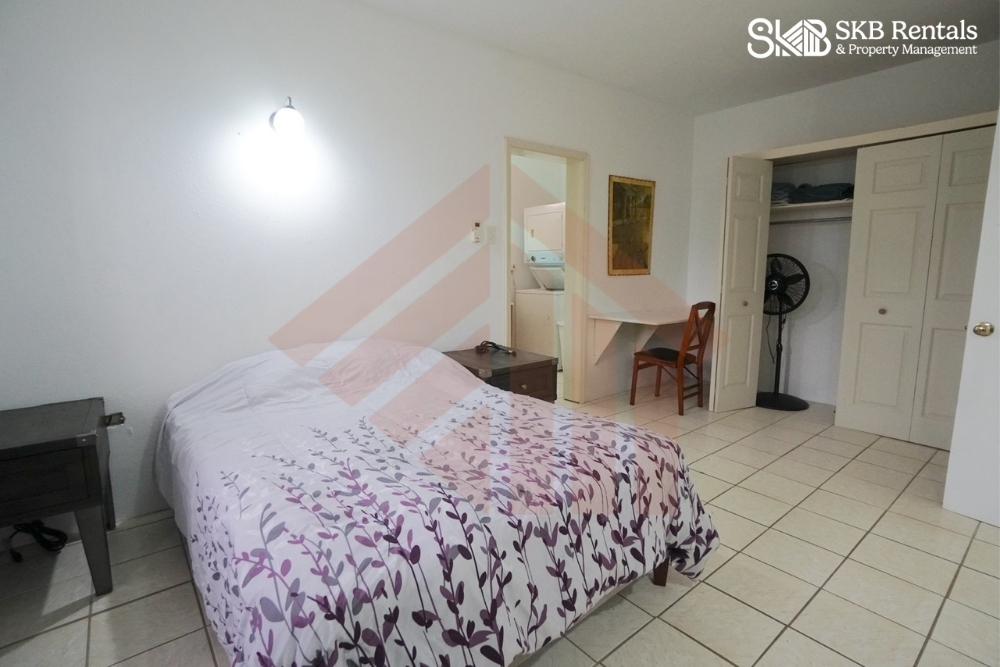 The entrance leads into a spacious open living, dining and compact kitchen area with gas stove and the usual appliances. The large bedroom has generous closet space, energy efficient air conditioner and if required a second tv point. The en-suite bathroom with shower also has the laundry facilities of washer dryer. The owner provides 1 TV in the apartment.