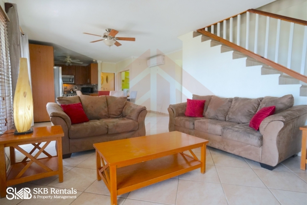 This villa is located on a corner lot offering 180 degree views of the Caribbean. Parking for 2 vehicles leads to the entry way which opens to the spacious air conditioned living space including a convenient laundry area and guest bath room and a kitchen with upgraded stainless steel appliances. The veranda which is accessed through french doors, features a plunge pool and a Viking BBQ and patio furniture so that the view can be enjoyed.