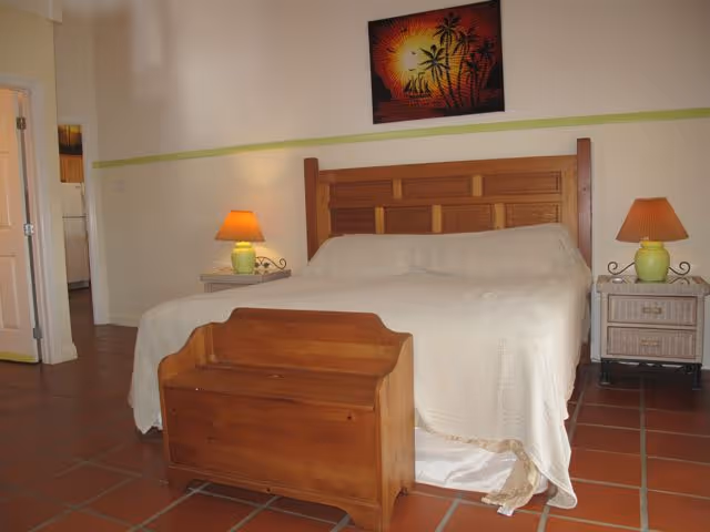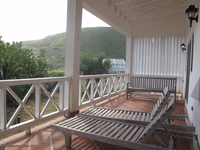 This Leeward Cove upper level condo is a two bedroom getaway in a very tropical setting with a private veranda that gives commanding views of the Atlantic Ocean. Its secure surroundings of the gated community also comes with a community swimming pool and tennis court. This delightful two bedroom condo is located within a lush tropical garden with a specular view of the Atlantic ocean in the Frigate Bay area. The design of the villa is exceptional in functionality and comfort, offering open-plan interiors with full modern kitchen that are accentuated by a large private veranda. The master bedroom has an en suite jacuzzi bath and detached loft which can account for a third bedroom.