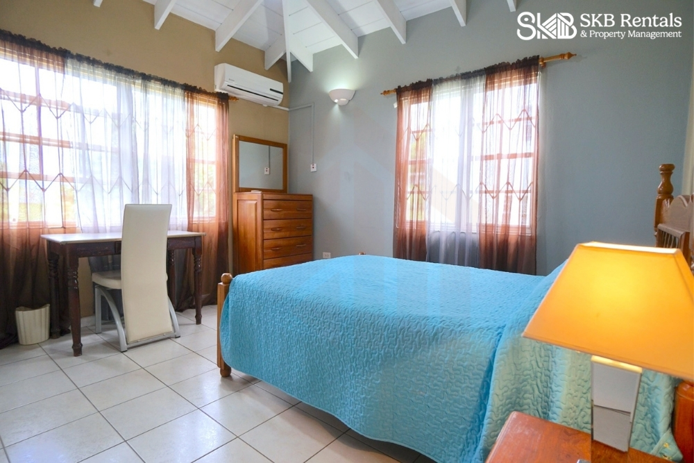 A short hallway leads to the bedrooms with the two guest bedrooms separated by a shared bathroom with shower and vanity. Both bedrooms have adqauate storage and windows allow for natural light and breeze. The master bedroom is spacious with walk in closet and ensuite bathroom with tub and vanity. All bedrooms are air conditioned and have ceiling fans.