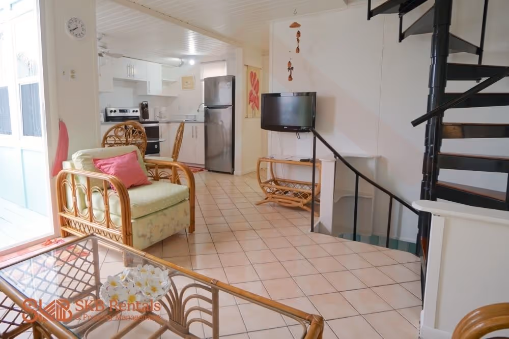 Spiral stairs lead up to the first of two levels and features the living room, dining area, kitchen, updated bathroom with shower and the first of the two bedrooms. The kitchen is well equipped and the living room has access to a small veranda overlooking the pool via sliding glass doors. The bedroom is airconditioned.