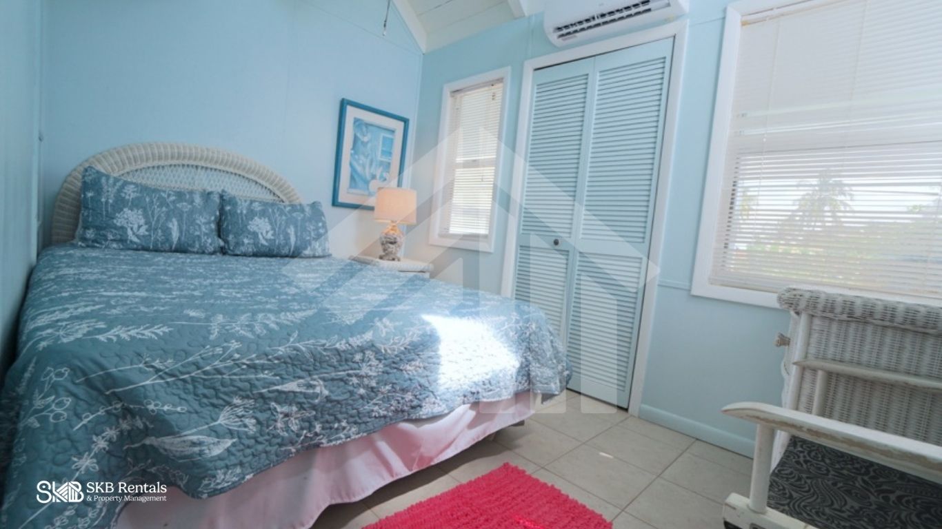 The first bedroom, located on this level, includes a queen bed, small closet area, and air conditioning for comfort.