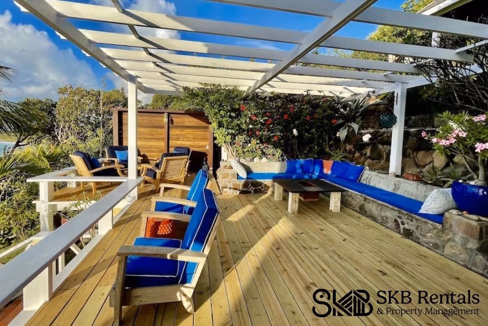 The main level has a large comfortable living room with built in bar and wine chiller, dining, library well stocked with a wide variety books. The living room has amazing views on three sides and large doors that open to the infinity edge pool and decks. An infinity edge pool with built in seating, large decks, guest bathroom, gazebo and built in seating and lounging area with private garden complete the outdoor space. There is also wireless internet and 60'' inch flat screen Smart TV with Cable TV and NETFLIX. The villa sits upon the hillside where the prevailing winds and ceiling fans will cool you as the waves lull you to sleep.