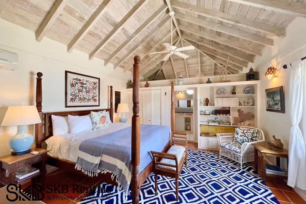 Ocean Song villa has antique and custom designed furnishings, original local paintings and prints, three large comfortable bedrooms all with beautiful Ocean views, two on the upper level and one on the main level, all with king-size beds, en suite bathrooms, AC and ceiling fans. The master bedroom has a large private deck, walk in closet and outdoor shower with natural stone. Only the bedrooms offer air conditioning.