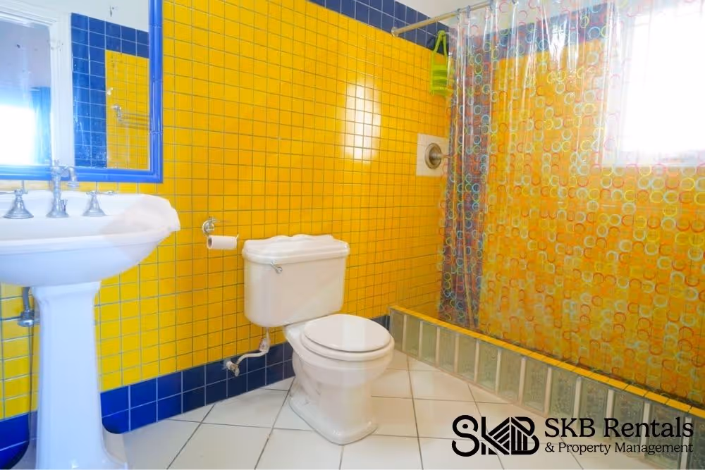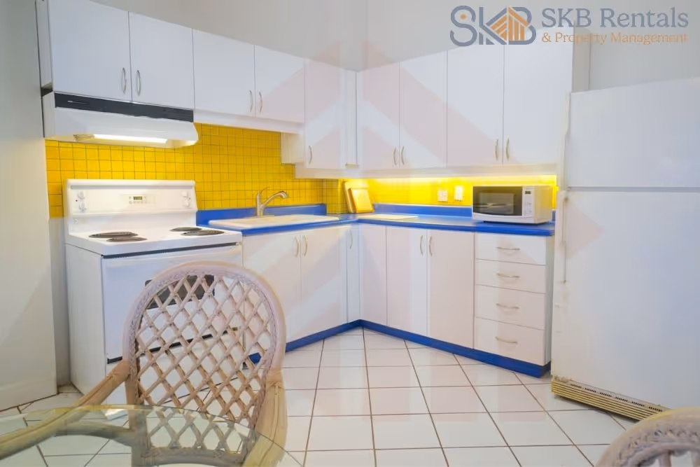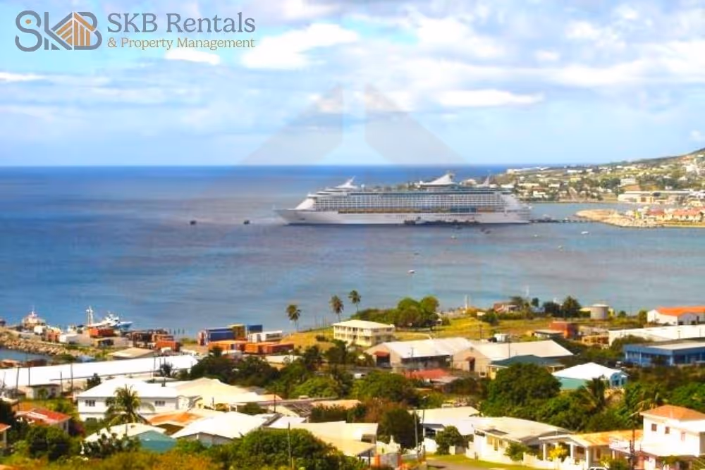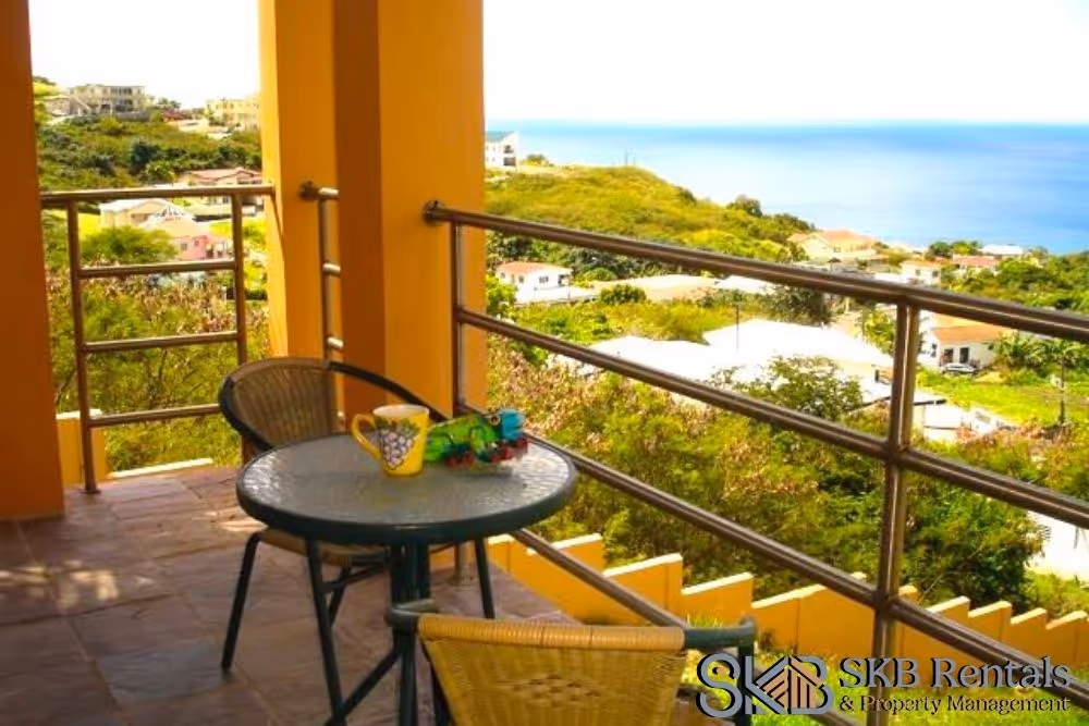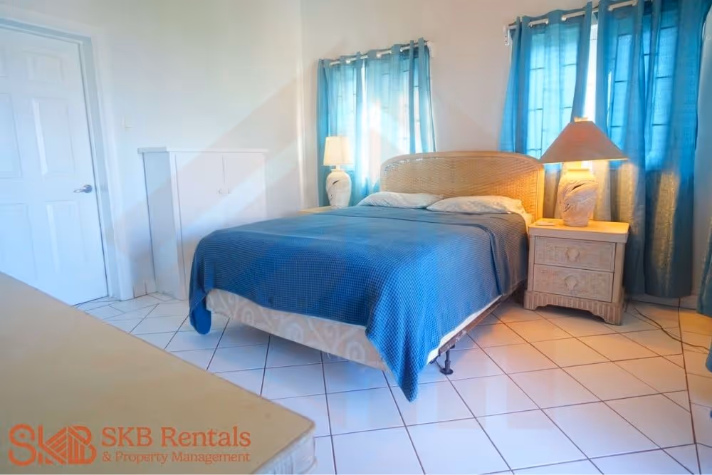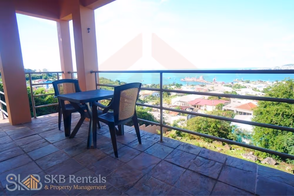 This one bedroom apartment which is accessed via some external stairs, offers sweeping views of Basseterre from windows which allow a lot of natural light into the apartment. The kitchen area has a laundry room with full size washer and dryer to one side before joining the open plan dining and living room. The living and dining area is not air conditioned.