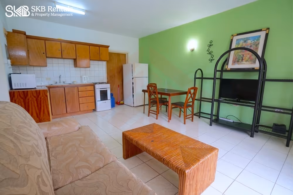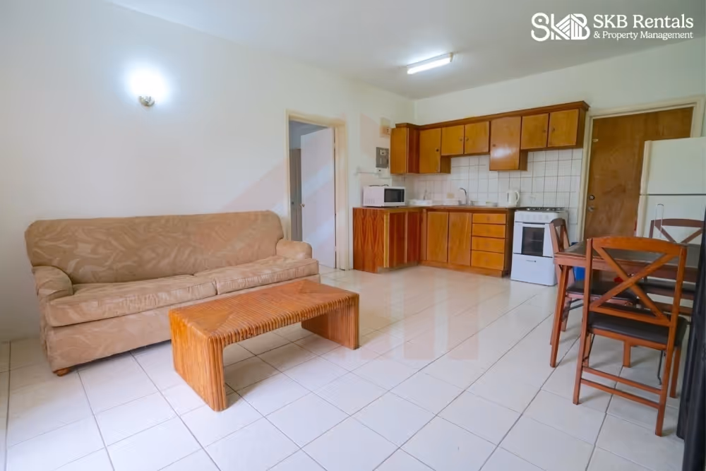 The entrance leads into a spacious open living, dining and compact kitchen area with gas stove and the usual appliances. The large bedroom has generous closet space, energy efficient air conditioner and if required a second tv point. The en-suite bathroom with shower also has the laundry facilities of washer dryer. The owner provides 1 TV in the apartment.
