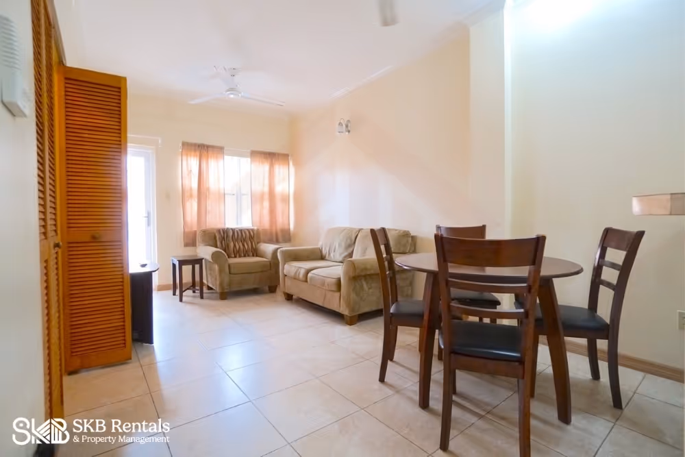 Located on the third floors and accessed via covered stairs, the apartments are accessed via a controlled security keyed entryway. Each apartments opens to the kitchen which has adequate storage and countertop space and dining area with seating for 4 persons. A comfortable couch and chair provide a space to enjoy relaxing and TV. Ceiling fans circulate air and the windows and patio door allow for natural light and air to enter the apartment. Each apartment has a private veranda.