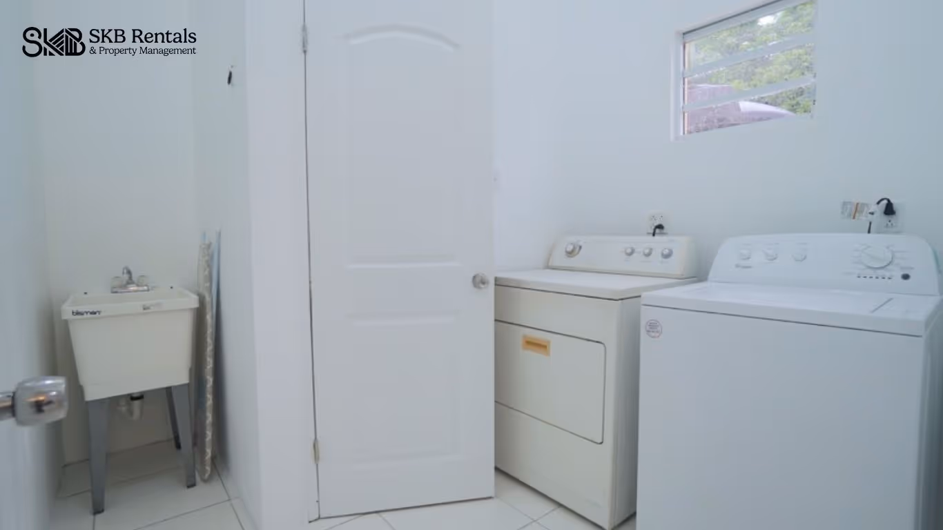 The laundry area has a washer and dryer and a small guest half bathroom.