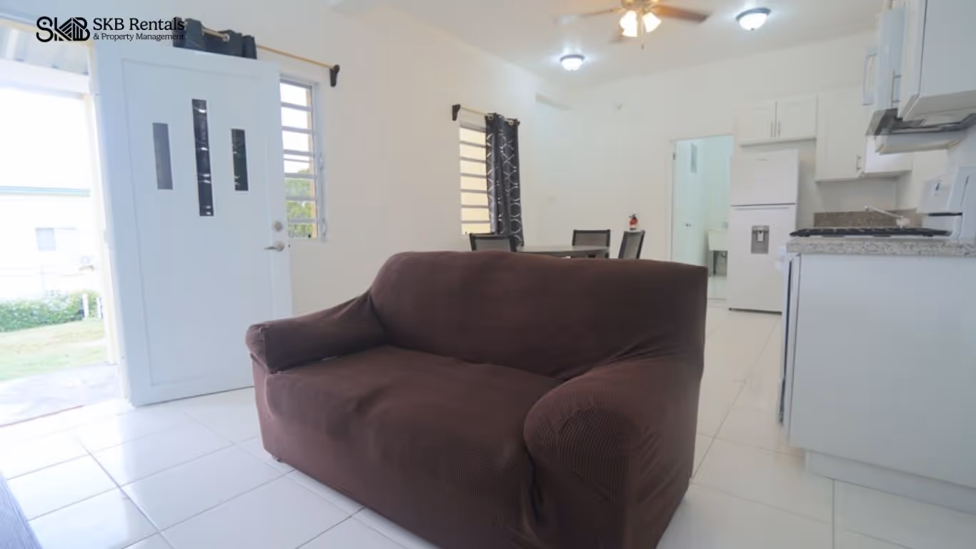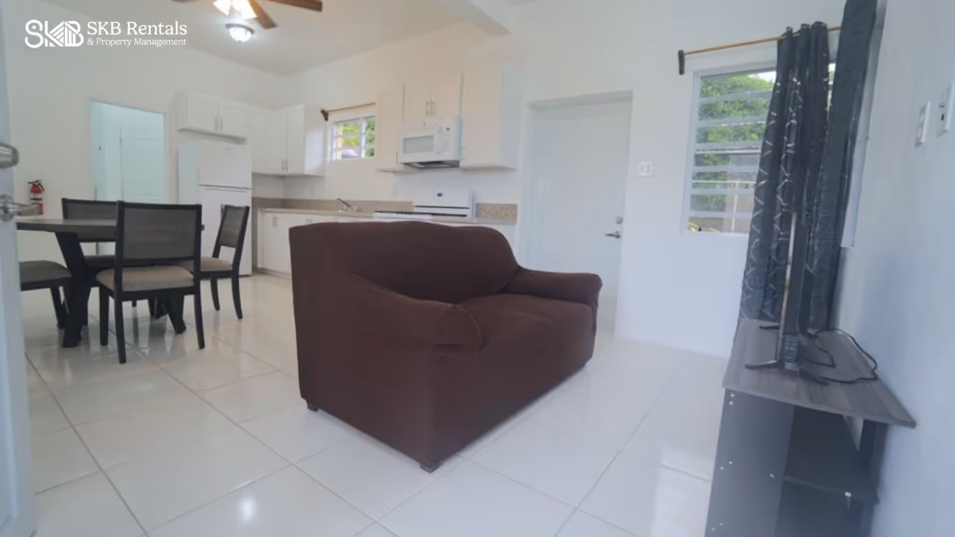 Located in Camps just a short walk from the main road and public transport, this furnished 1 bedroom apartment is move in ready. From a gated access, there is off road parking leading to the covered entrance way which opens to the spacious living, dining and kitchen area. The kitchen is well equipped with generous storage space and granite countertops and features a gas stove and the usual appliances. A dining table with seating for 4 is provided as well as a comfortable sofa and TV.