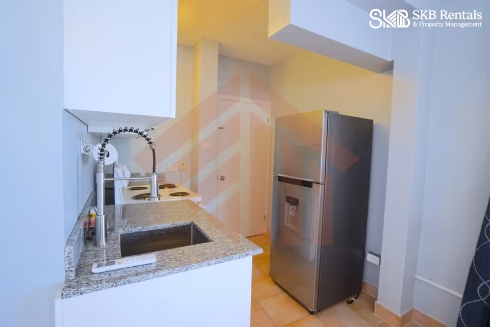 The apartment features a compact efficiency kitchen to enable meals to be prepared.