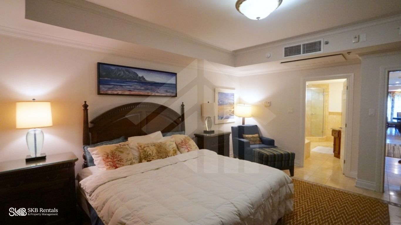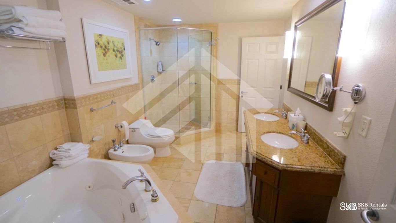 The generously sized bathroom is thoughtfully designed with a walk-in shower, full bathtub, and a large granite-topped vanity. It offers dual access from both the bedroom and the hallway for added convenience.