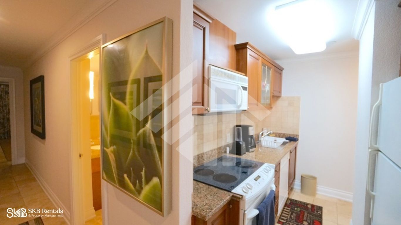 The galley-style kitchen is well-equipped with modern appliances and finished with sleek granite countertops, providing a functional and stylish cooking space.