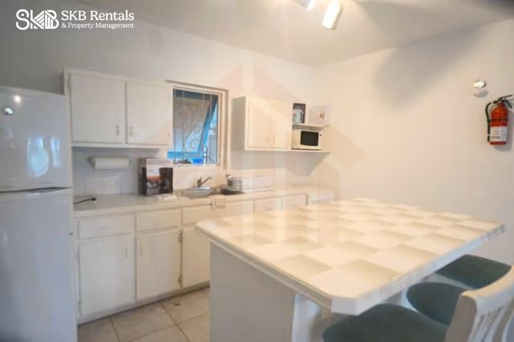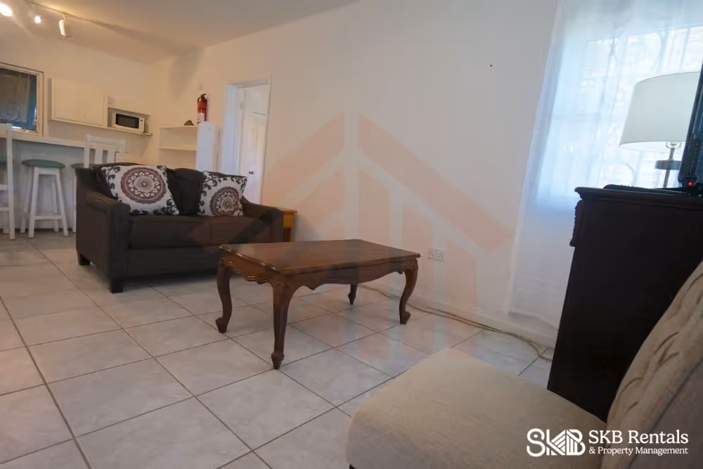 Located in the heart of Frigate Bay this ground floor apartment is offered fully furnished. Off road parking leads to a private garden entrance and the covered veranda with views of the SE peninsula. The living, dining and kitchen area with breakfast bar also features the laundry area with full sized washer and dryer. A large air conditioned spacious bedroom with generous storage and en-suite bathroom with shower has a number of windows allowing for natural light and breeze. Recently updated the apartment is offered furnished. The covered veranda opens onto a fenced garden area and views of Frigate Bay.