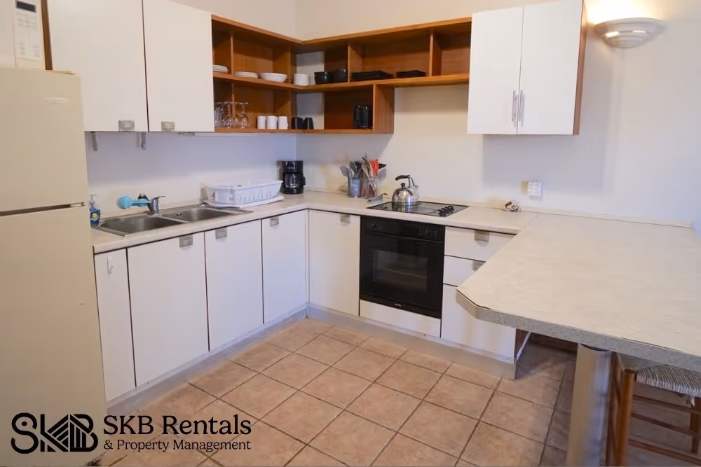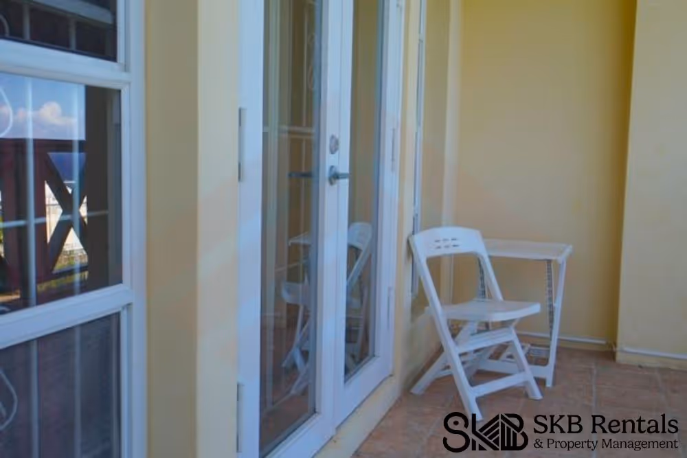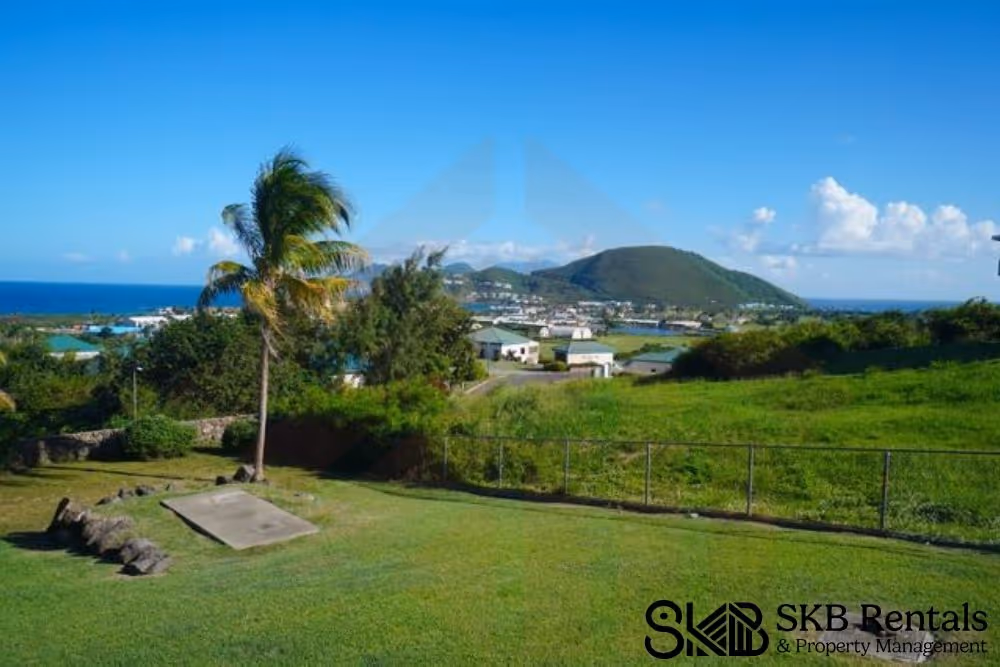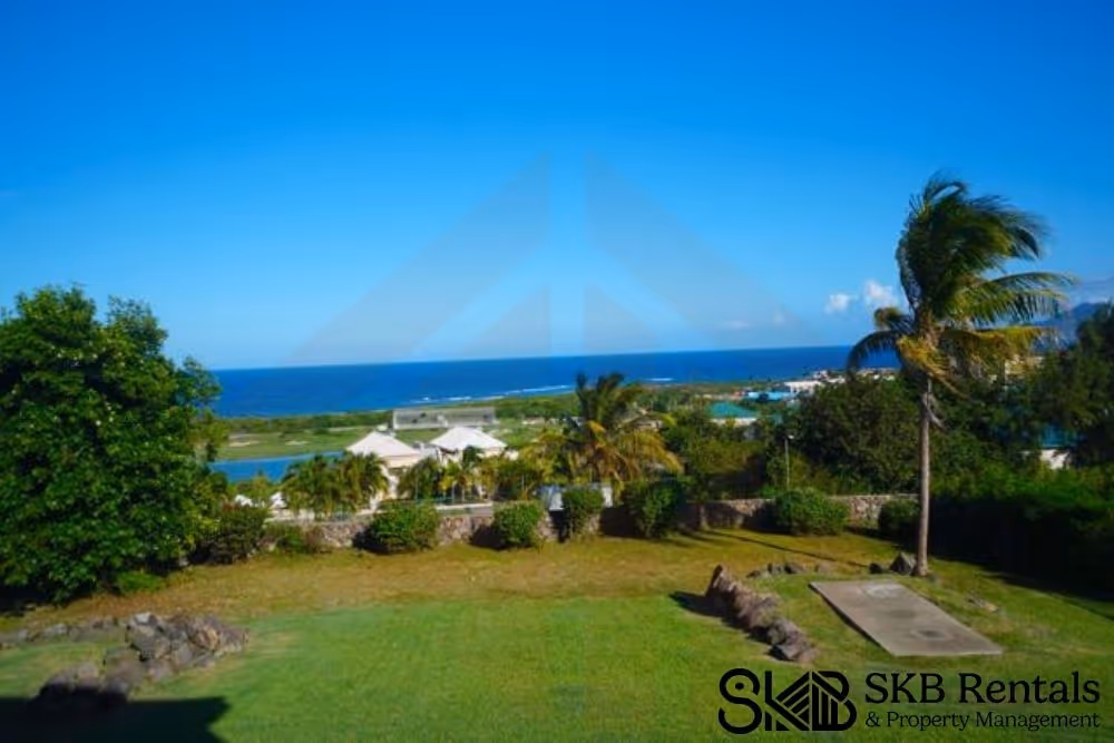This spacious furnished 1 bedroom apartment with ensuite bathroom and large walk in closet sits on an elevated rise that overlooks the Atlantic Ocean and the Royal St Kitts golf course. This apartment is fully furnished and maintains its own privacy. The open plan living and kitchen area also houses the washer and dryer and has ceiling fans but no air conditioning. Large french doors with security doors and insect screens allow for natural air flow. All windows have insect screens. The large bedroom is air conditioned and has a large closet and en suite bathroom. The property has security bars in all windows and the french doors to the veranda. The property is cable/tv enabled and internet ready for the tenant.