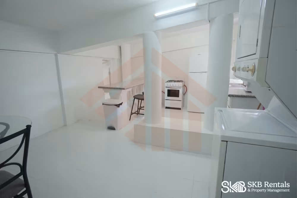 Access to the apartment is via some external stairs which lead into the entrance way of the unit. The kitchen and dining area are accessed via a low level door way and feature granite countertops, adequate storage and a pleasant breakfast bar. A separate dining table and chairs offers additional seating. A washer and dryer is located in this area. One bedroom is accessed through the kitchen area and features a raised sleeping area with raising sleeping area. A closet area is adjacent to the bedroom.