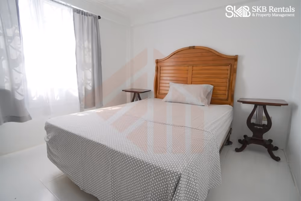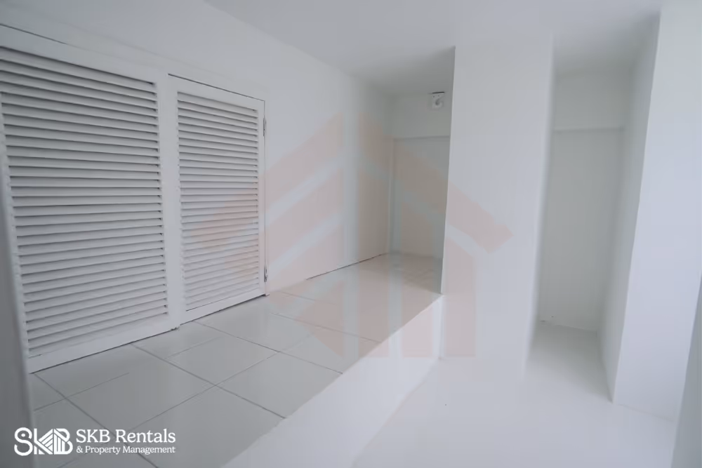 The second bedroom and bathroom is located at the end of the corridor which also features a sitting area with TV point. The shared bathroom offers a private shower and toilet area and separate vanity with storage. The second bedroom is off this area. Both bedrooms are air conditioned and the apartment is well ventilated and offers natural lighting.
