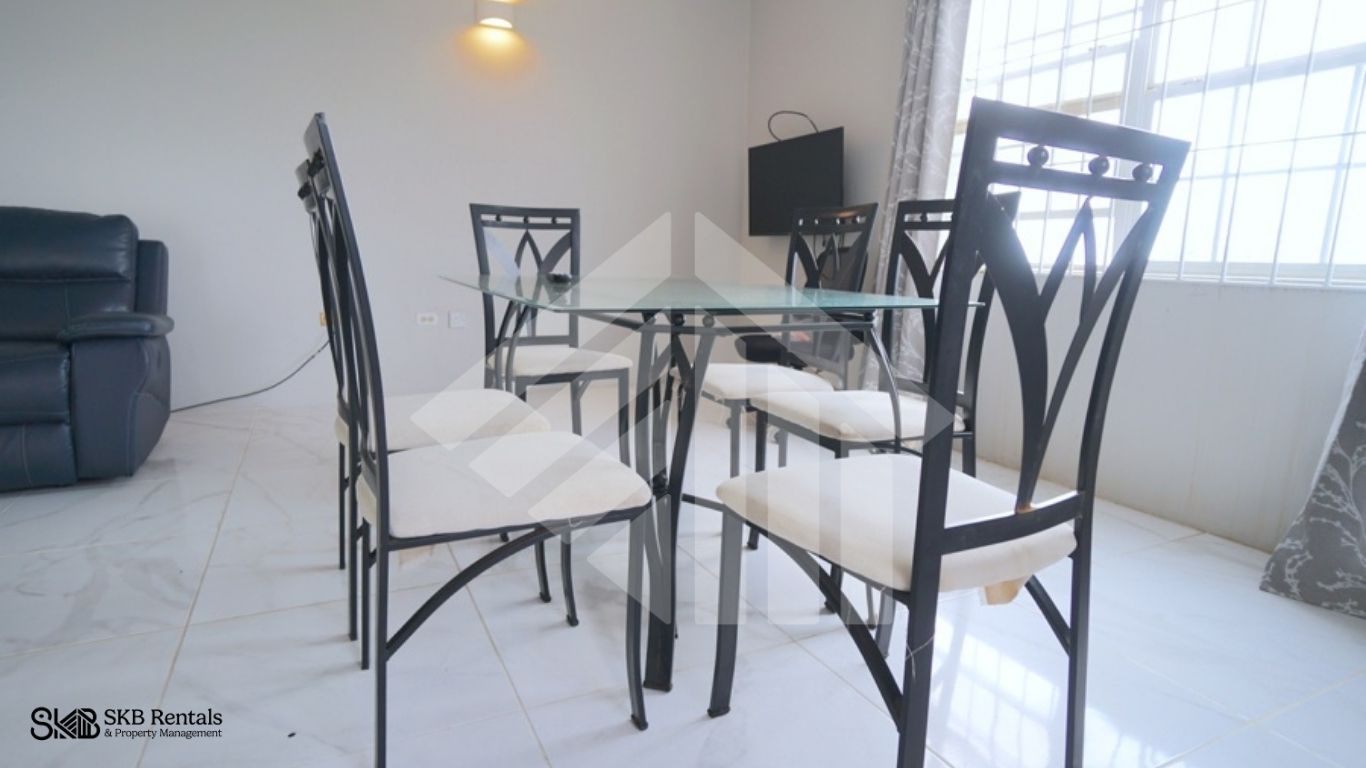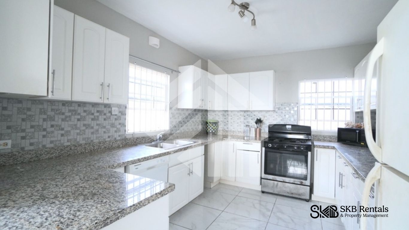 The kitchen is well-appointed with granite countertops and ample storage, making it both practical and stylish. It opens to a dining area with seating for six and a large open-plan living room, providing plenty of space for relaxing or entertaining.