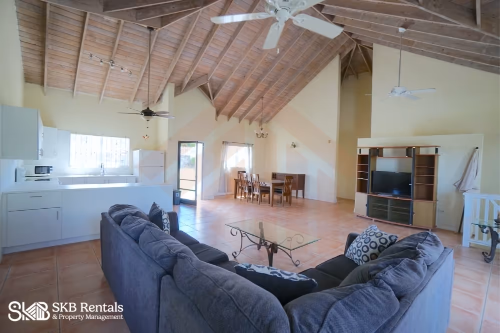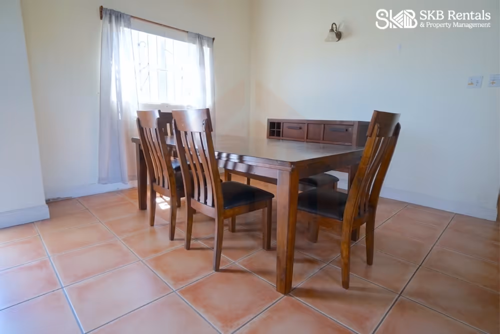 This stand alone home offers a perfect furnished 3 bedroom rental. With entry via electronic gate and a fully fenced yard space this properyt is perfect for pets or families. The open plan concept for the main levels offers a large dining area with seating for 6 persons, an updated kitchen with generous storage and countertop space for meal preparation and a large seating area for gathering. To the right of the home access from the garage opens into the living room area.