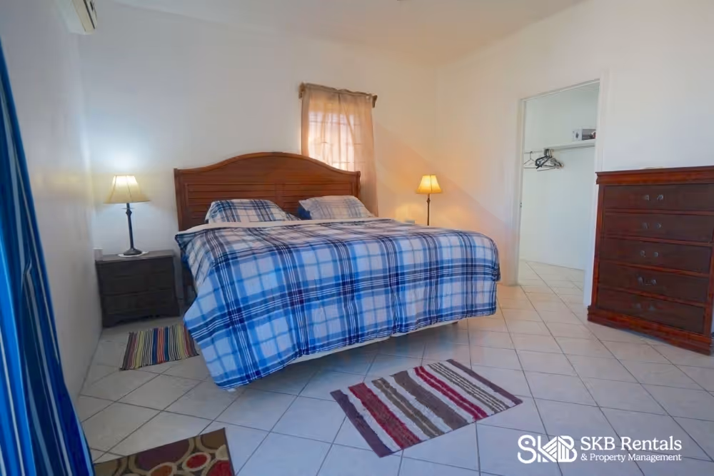 Golf View Villas is conveniently located in the heart of Frigate Bay and has easy access to all amenities such as casino, restaurants, hotels, bars, coffee shops and grocery stores. This upper level one bedroom apartment is offered furnished. The entry way opens into a large air conditioned living room, dining kitchen area which is adequately stocked and provides storage and counterotop space.