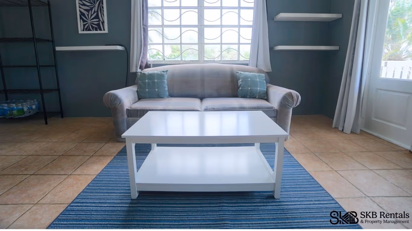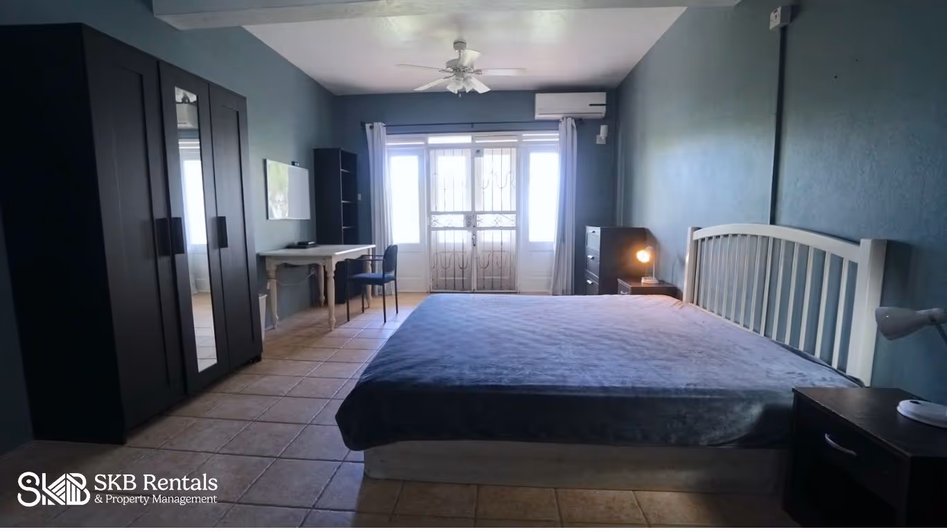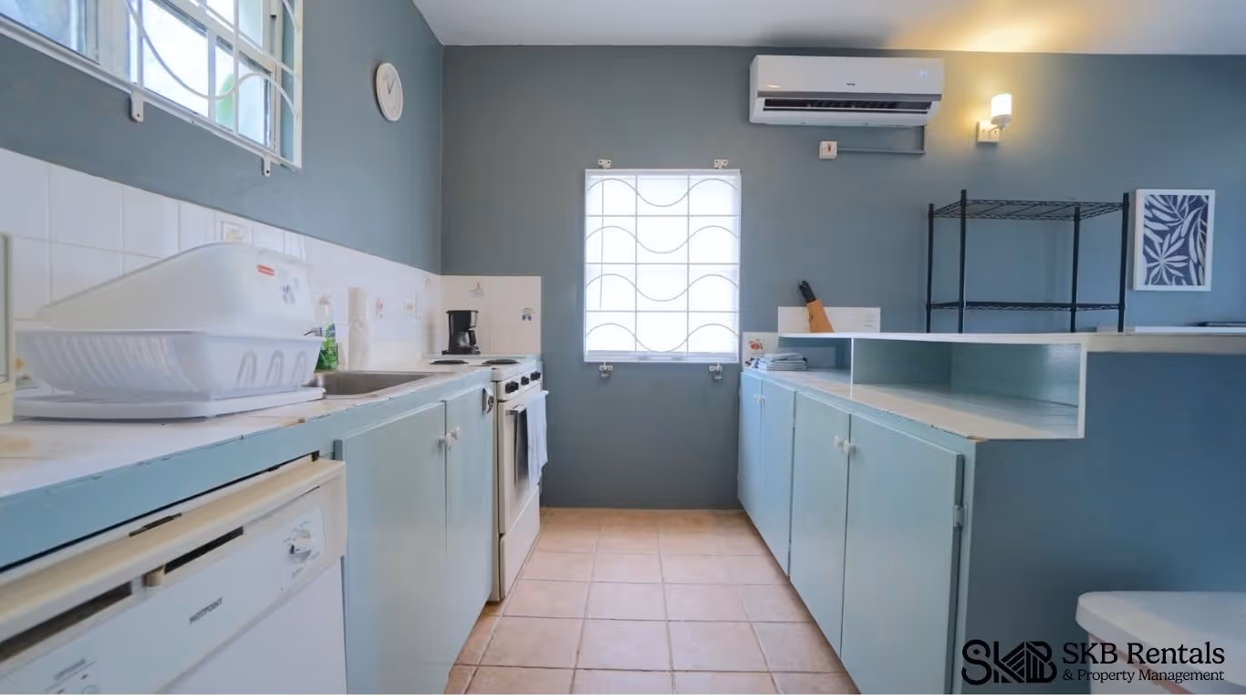 This large 1 bedroom apartment is accessed via double french doors from a covered veranda which overlooks the St Kitts Marriott Golf Course. The open plan living area, which is air conditioned, has a seating area and a large, fully furnished kitchen with dishwasher.