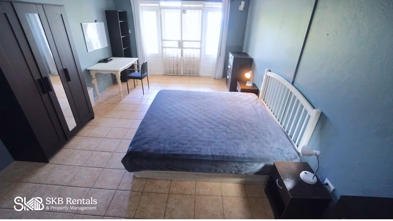 The spacious bedroom has a king size bed with linens, very large study desk and a wall of bookcases and is also air conditioned. A full bath with large shower is adjacent to the bedroom.