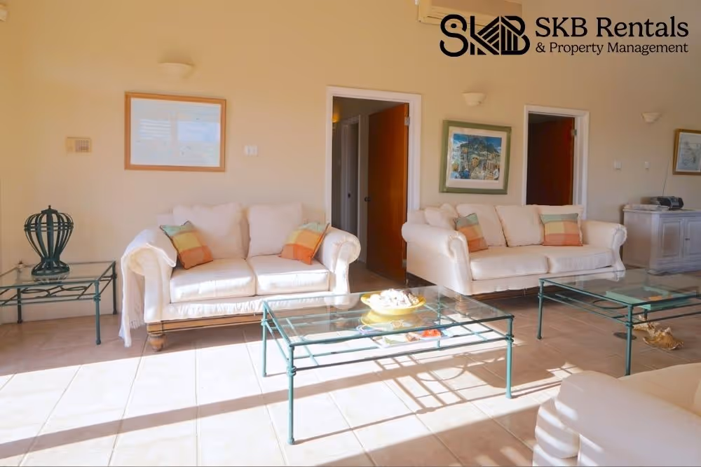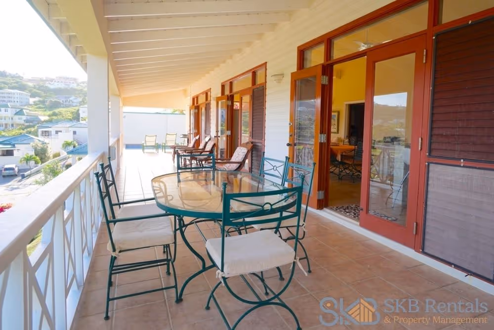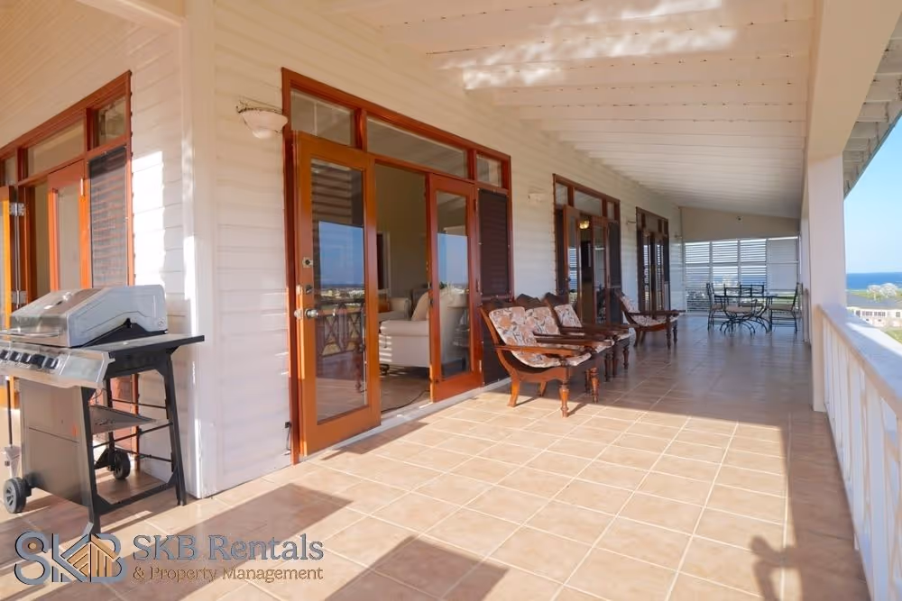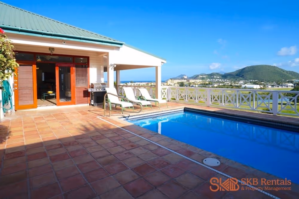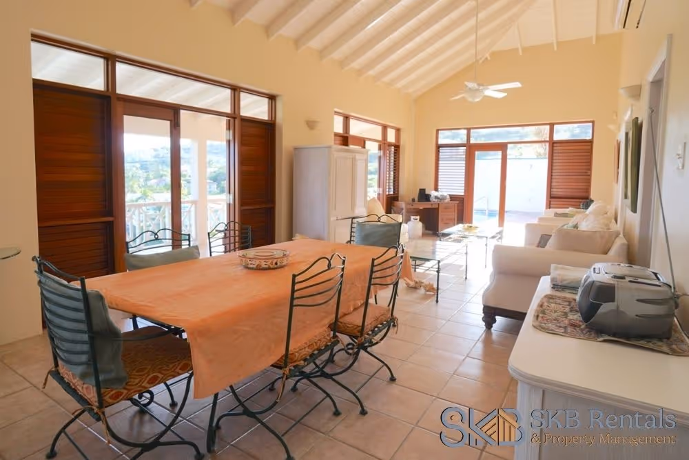 Perched on the hillside in Half Moon Bay this beautiful villa has a panaramic view of the Atlantic Ocean, golf course, Southeast Penisula and St. Kitts sister island, Nevis. This spacious villa has a large fully equipped modern kitchen and the wooden french doors lead to the covered veranda and outdoor eating area.
