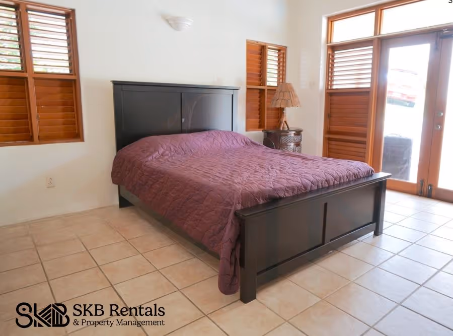 A corner lot with a furnished stand alone 2 storey villa is available for long term rental. The off road parking leads to a walled pool terrace with a wrap around veranda with views of the golf course. The entrance way opens to the open plan living and kitchen area which is cooled by ceiling fans and tropical breezes from three sets of double french doors and screened windows. The large air conditioned master bedroom and bathroom with a tub are located on this upper level and the bedroom has double french doors that open to the pool deck. Internal stairs lead to a large air conditioned second bedroom on the lower level with private bath and further covered veranda.