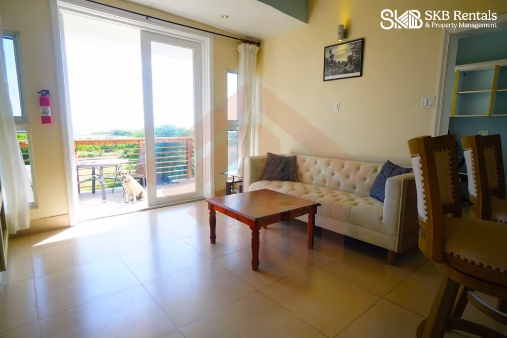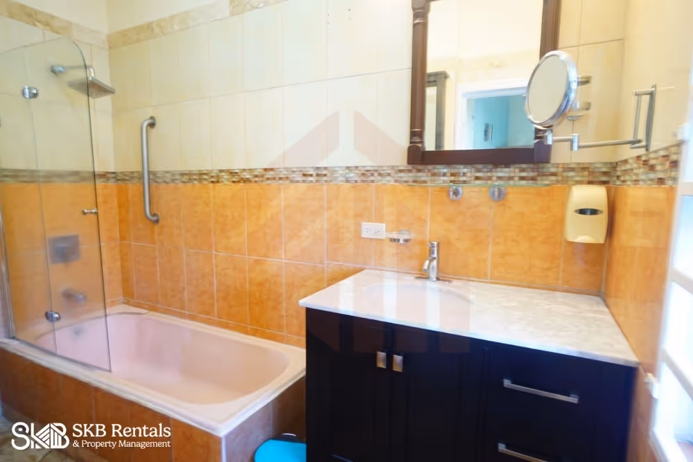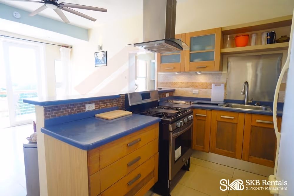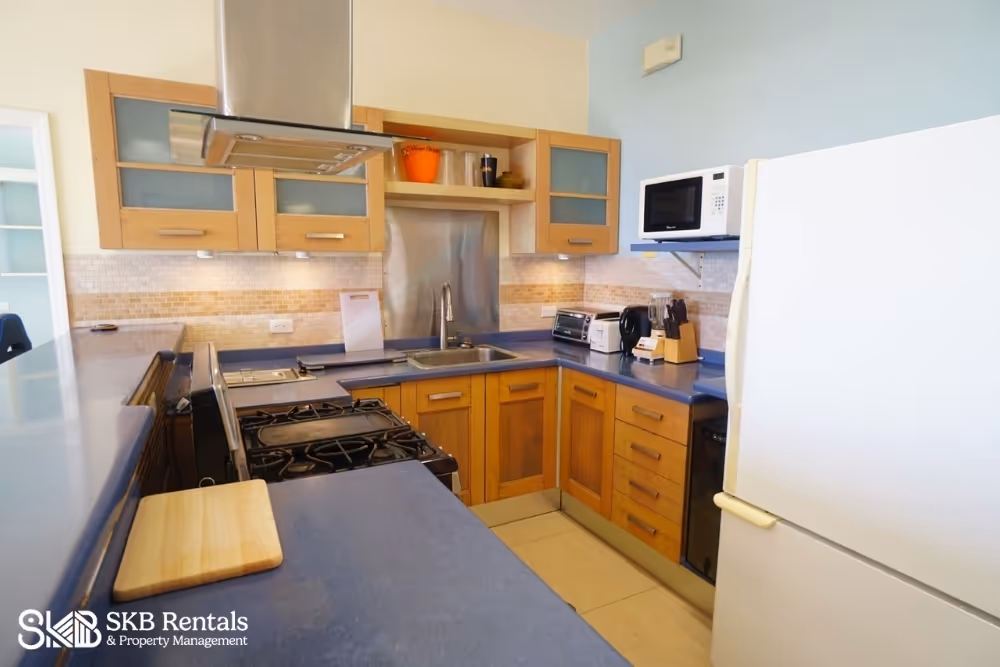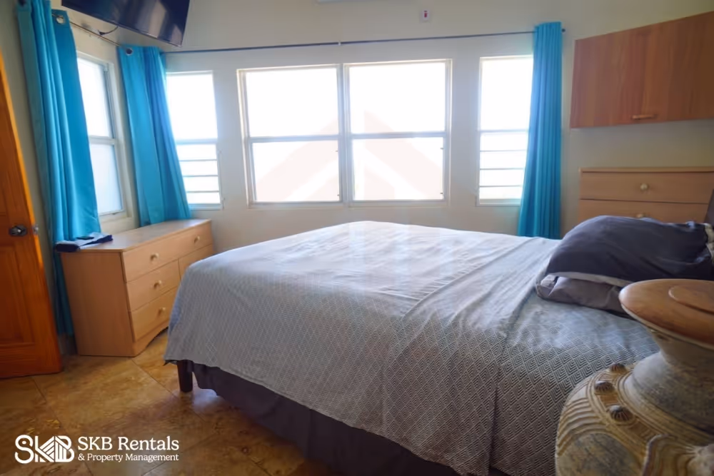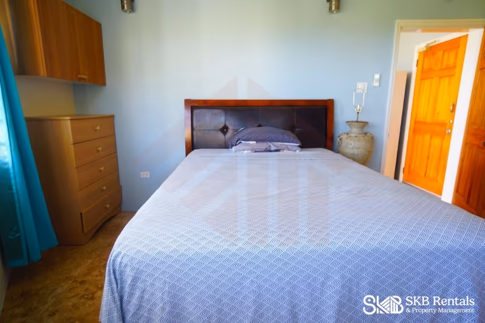 This lower level apartment is located on a quiet residential street minutes from Frigate Bay. From the road side parking area and access through a restricted access gate, the garden steps lead to the lower level of this property and the veranda entrance. Double french doors open to the living room with wall mounted TV has a large ceiling fan and the kitchen with breakfast bar seating is well equipped with gas stove and generous counterspace and storage.