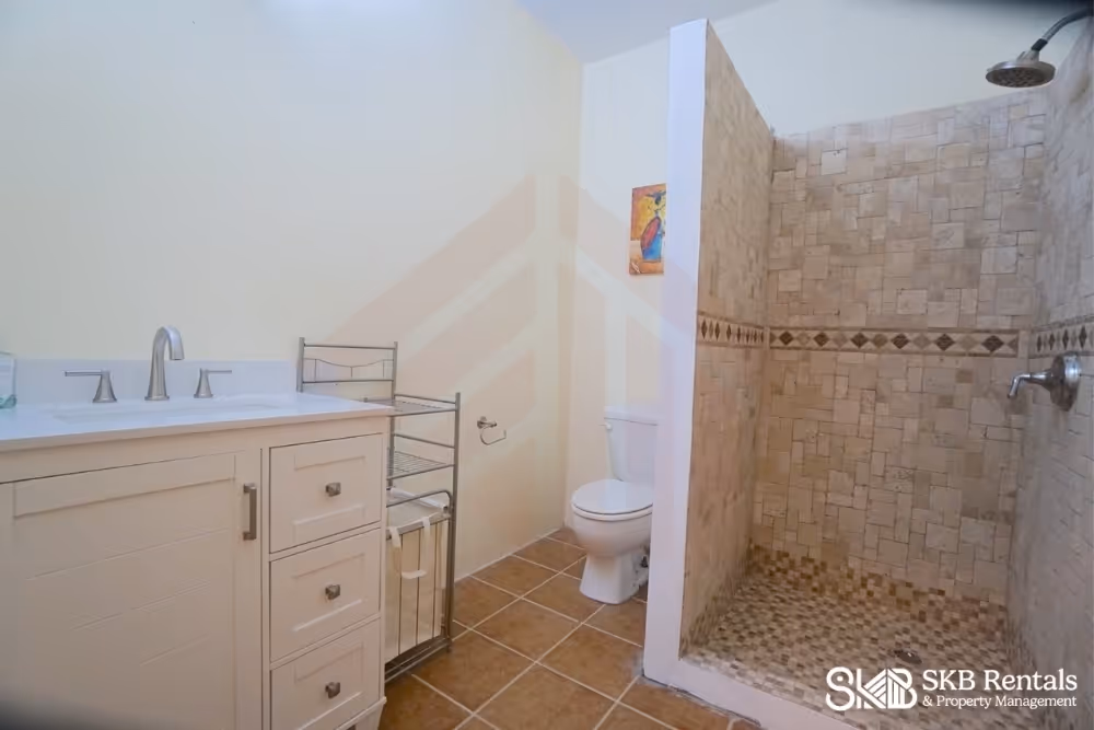 The shared bathroom is opposite the bedrooms and accessed via the laundry area with washer and dryer. The updated bathroom offers a shower and vanity.