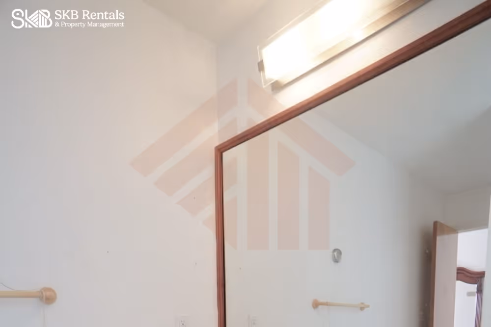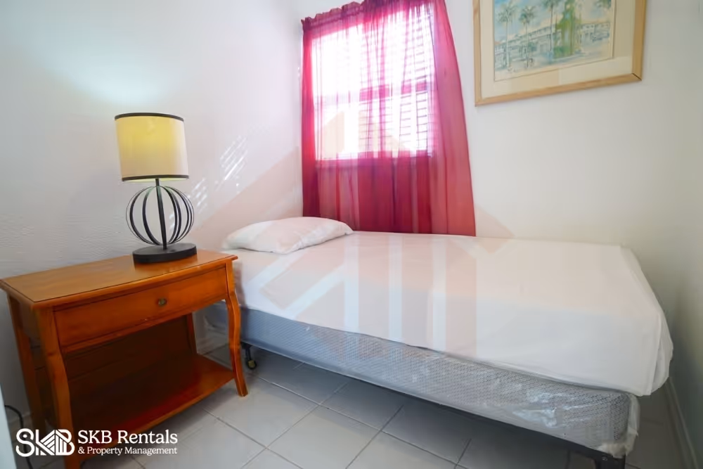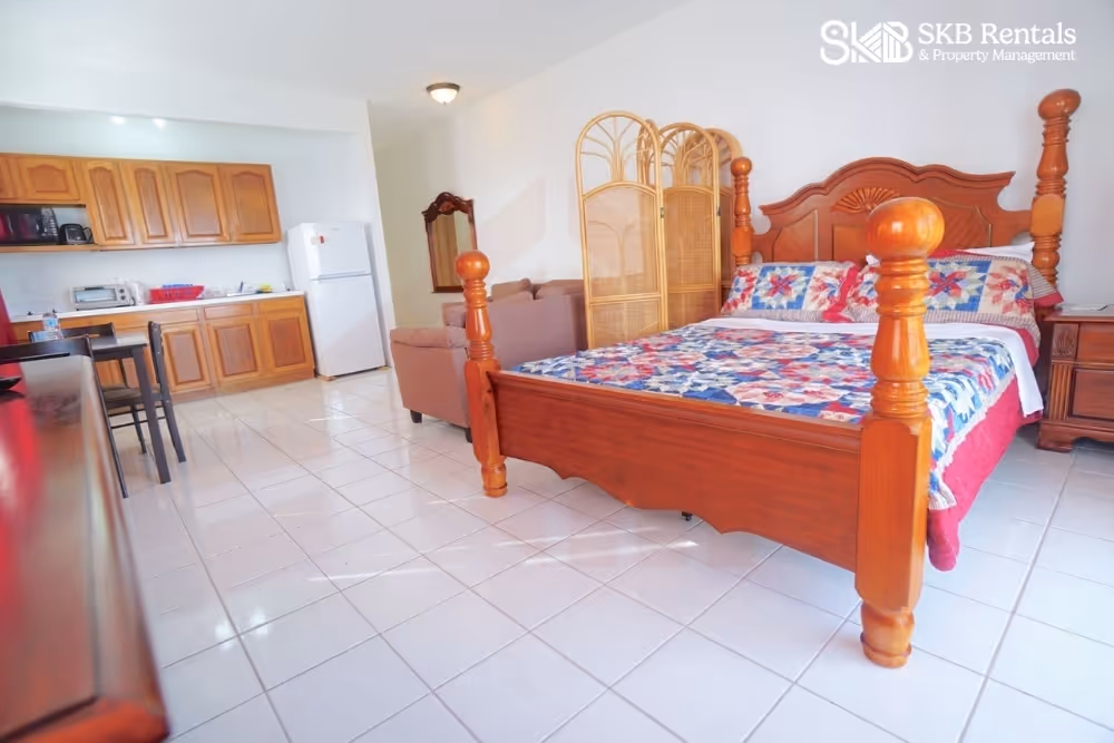 This furnished studio apartment offers entry from the key pad door lock, the guest bedroom area or office space is immediately to the right with the washer and dryer units and bathroom with tub and double vanity conveniently located.