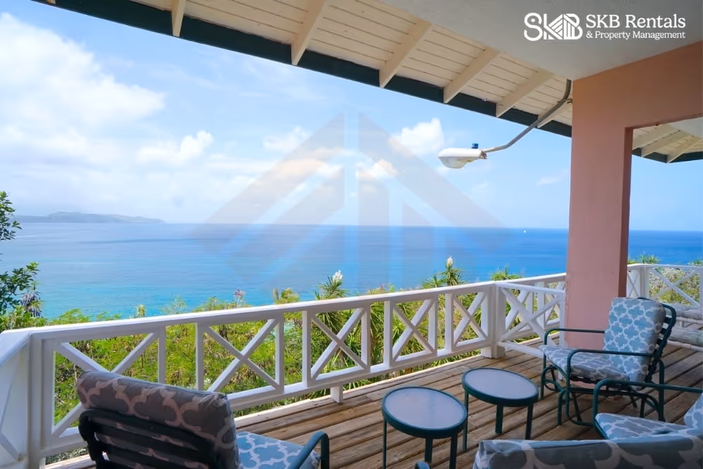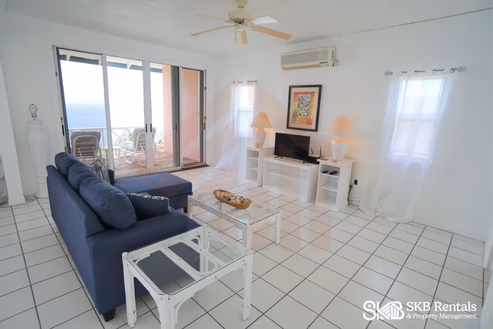 This spacious 2 bedroom villa offers arresting ocean views from the entrance way throughout the villa and including both bedrooms. A parking area leads into the villa with a galley style kitchen which is well equipped and features a breakfast bar to the open plan dining room with seating for 6 and a comfortable area with seating and relaxing as you watch TV.. Large sliding glass doors open and lead to the covered veranda and the outstanding views of the SE peninsula, Nevis and the Caribbean beyond. A guest bathroom is conveniently located on this level as well as the laundry. The upper level of the villa is air conditioned for your comfort.