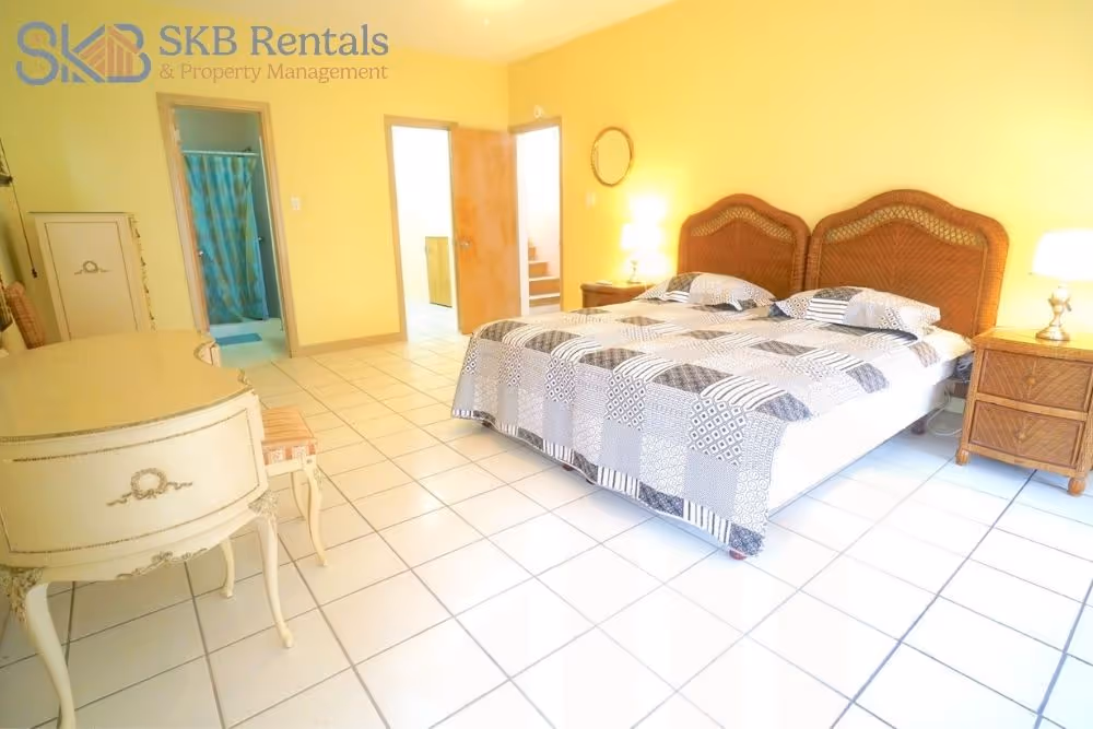 The lower level which is accessed via stairs features two large en suite bedrooms which are air conditioned and each have private en suite bathrooms. Both baths only feature showers not tubs. Floor to ceiling sliding glass doors open to a small unfenced garden area. The villa is completely secure with Ross approved security bars on all windows and sliding glass doors. Hurricane shutters also offer additional security during inclement weather. A laundry room with washer and dryer completes this property.