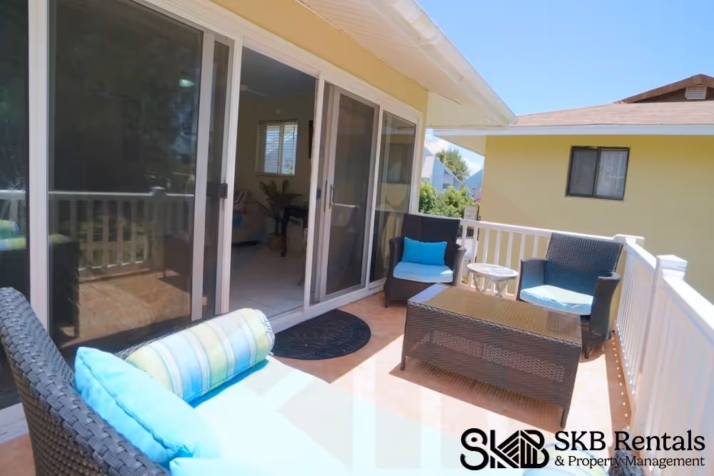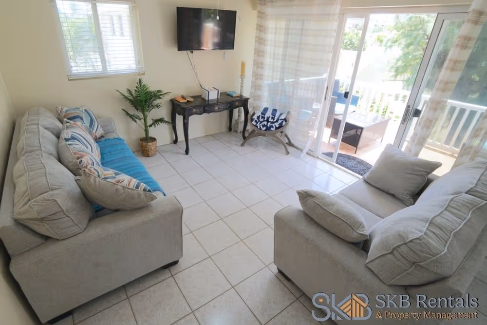 Experience the perfect getaway in this charming 2 bedroom upper level vacation rental located in the heart of Frigate Bay. Off road parking in front of the unit leads to the exterior stairs to the upper veranda offering views of the mature gardens and pool area. Entry to the unit is via sliding glass doors with screens which provide light and allow for the cooling tropical breezes. This beautifully furnished 2-bedroom rental is perfect for a relaxing vacation. With comfortable beds, a fully equipped kitchen, and a cozy living area, you'll feel right at home.