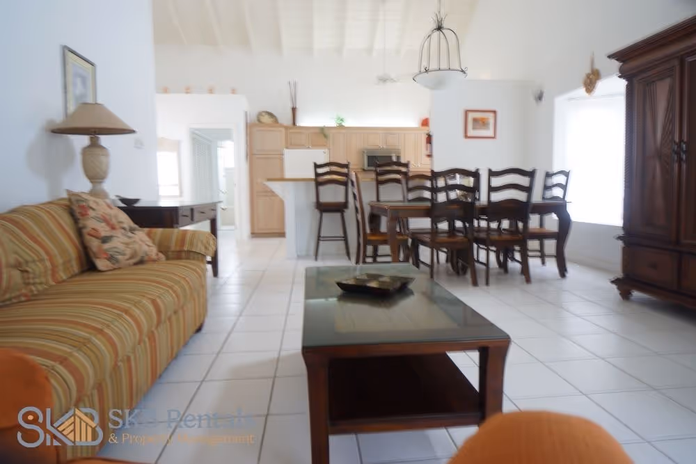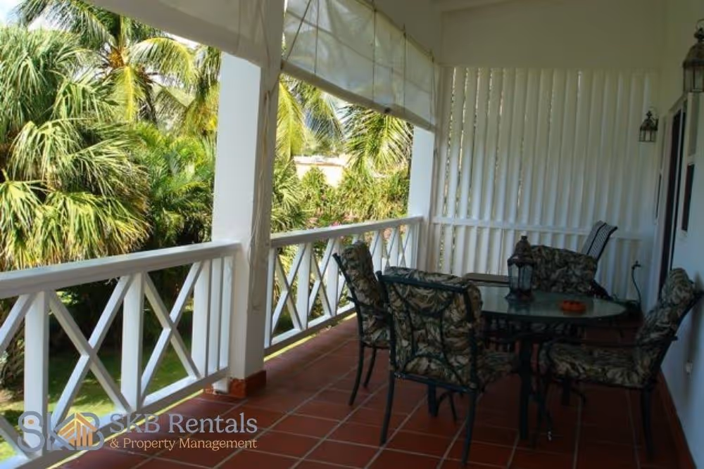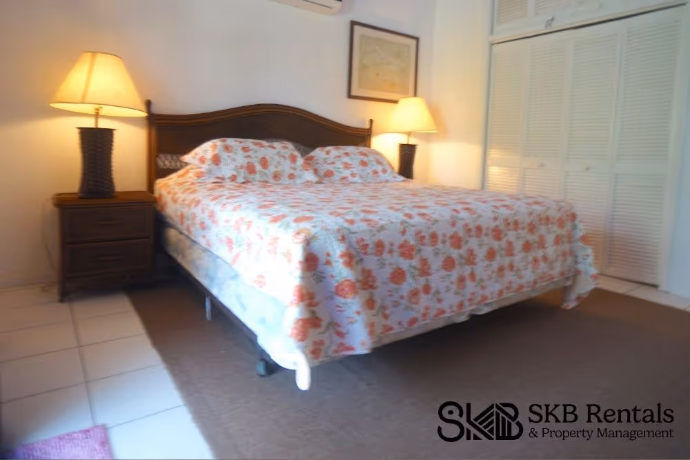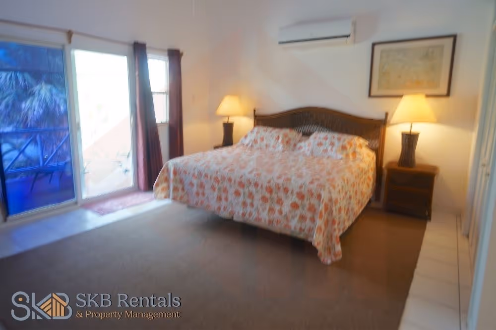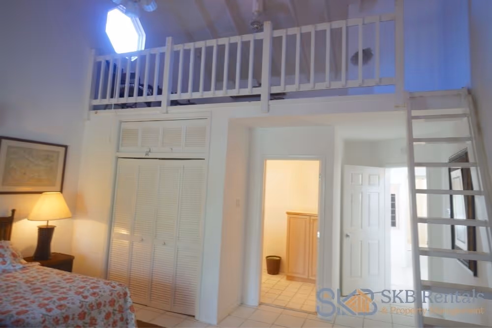 Tastefully furnished this air conditioned two bedroom, two bathroom unit is completed with a fully equipped kitchen and full size washer and dryer units in a separate laundry area. A large loft area on the upper level offers space for a home office or a small guest bedroom and is cooled by air conditioning from the master bedroom. A large covered veranda overlooking the well kept tropical gardens allow you to extend your living space to enjoy the tropical breezes. Each unit comes with a designated parking space and the development is the first gated community on the island and is enhanced with a development wide generator that switches on automatically in the absence of island power outages.