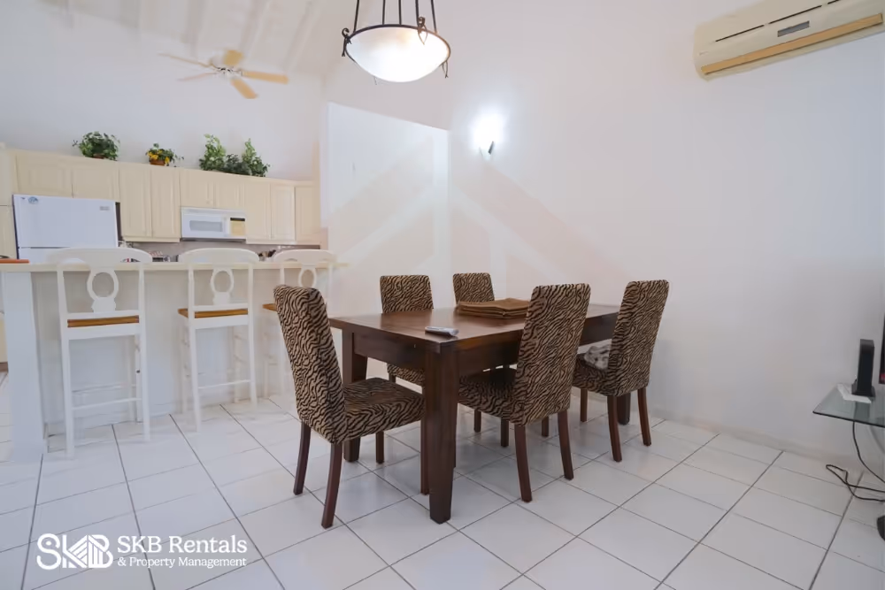 Located in Leeward Cove, this upper level unit is offered furnished for rental. Entrance to the unit opens into a spacious open plan living, dining and kitchen area with vaulted cathedral ceilings and framed by sliding glass doors which open to the covered veranda which overlook the tropical garden setting.