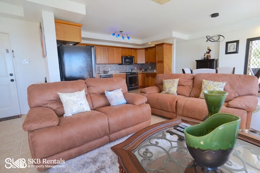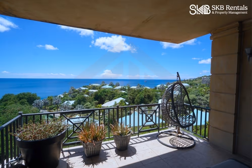This 3 bedroom unit has been furnished by the owner with personal touches and provides and oasis of calm in the heart of Frigate Bay. Off road parking and a short number of steps lead to the apartment which opens to a wall of windows and the open plan living, dining and spacious kitchen area. The kitchen features generous storage space and granite countertops and is conveniently located to allow for family interaction and entertaining. The comfortable seating area is flooded with natural light from the windows which offer ocean views. A small covered veranda off the dining area is private and perfect to watch the sunset.