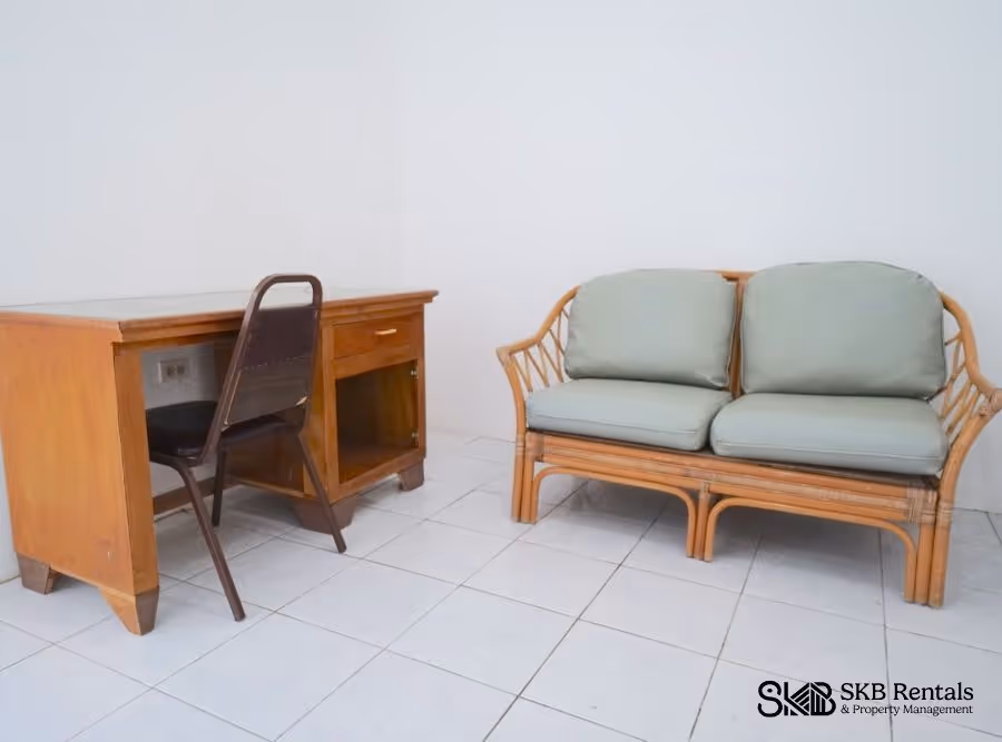A small office area features as study desk and sofa and is situated between the bedroom and the bathroom. The bedroom is airconditioned for your comfort and has a large window for natural light and breeze. The bathroom has recently been retiled and has a walk-in shower, vanity and toilet