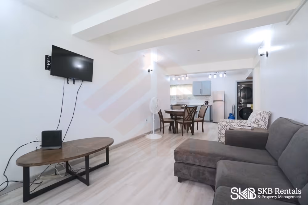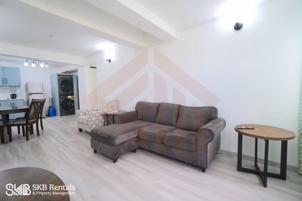 The apartment entrance opens to the living room and leads towards the kitchen and laundry area. This area is not air conditioned. The kitchen has generous cupboards and storage space and features a gas full size stove. The laundry area has a washer and dryer for your convenience.
