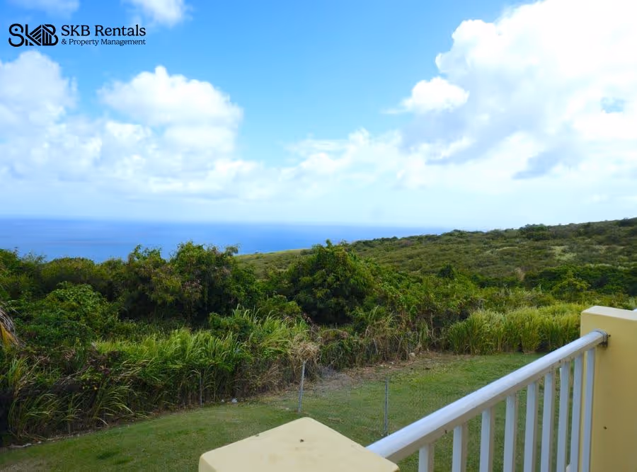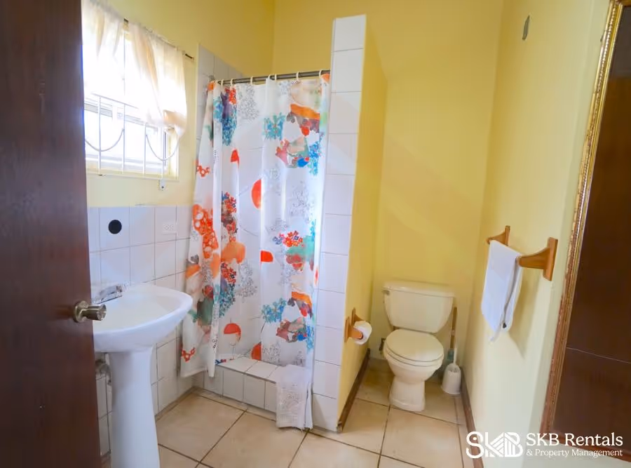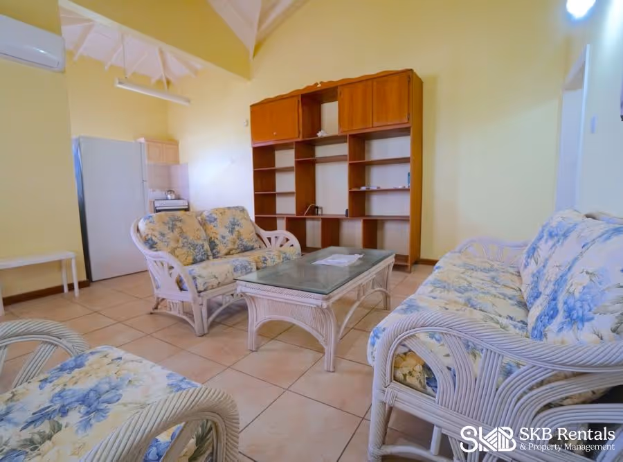 Entrance into the grounds via a gate allows for off road parking and leads to the upper entrance way with key pad access to the interior of the building. This unit is on the upper floor and the entrance opens to a large sitting area with dining table and seating and the kitchen area which has adequate counter top space and storage and features a gas stove. A covered veranda opens off the living room and provides sweeping views of Basseterre and the Caribbean. This space is air conditioned for your comfort.