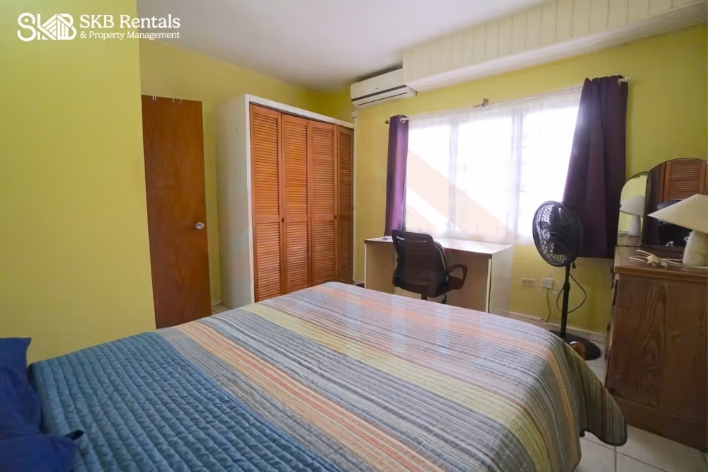 The large bedroom with built in closest space a large window for light and breeze. The bedroom is air conditioned. The bathroom has a walk in shower, vanity and toilet.