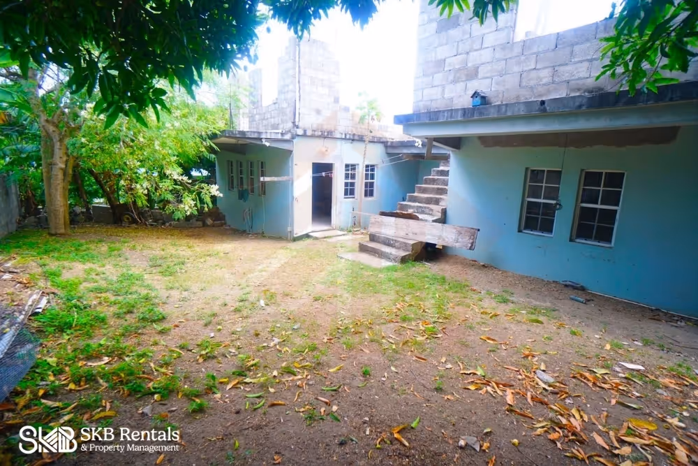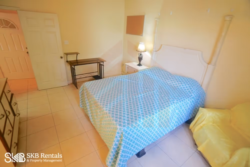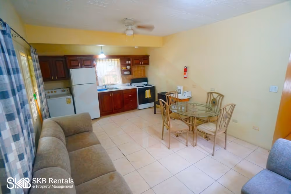 Furnished upstairs apartment in a 5 apartment complex with security bars and screens in windows & door, hot water to all taps, one set of linens provided for queen size beds, A/C in bedrooms with ceiling fan in bedrooms & living room, TV, microwave, refrigerator, stove, dining & kitchen ware, pots & utensils. Each unit has private laundry facilities with washer and dryer, iron and ironing board. House has 110v electrical supply.
