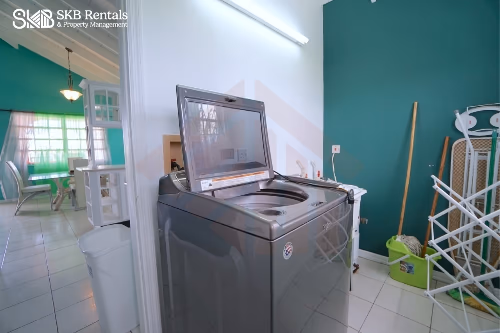 Stairs lead to the covered veranda and opens to the open plan living room, dining area with seating and kitchen with breakfast bar and serving hatch. The kitchen is well equipped with generous counterspace and storage and is well equipped. Behind the kitchen is a separate laundry area with washer and laundry sink and the garden has line drying.