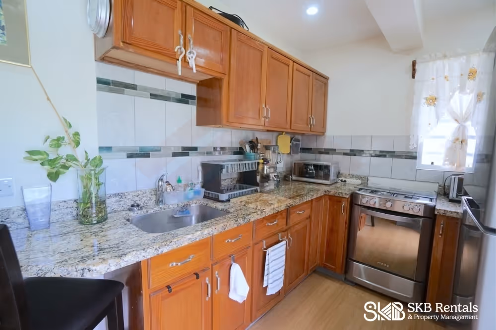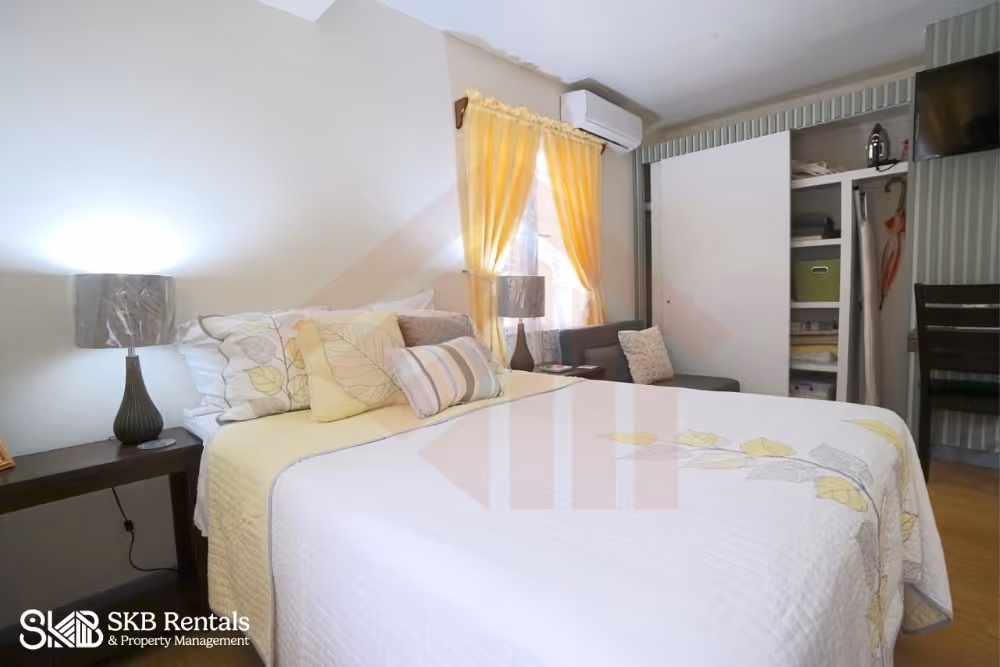Comprising of a well equipped kitchen with gas stove, toaster oven, microwave as well as pots, pans, plates etc. A washing machine is also provide as is access to a dryer. A seating area by the countertop allows for enjoyment of meals.