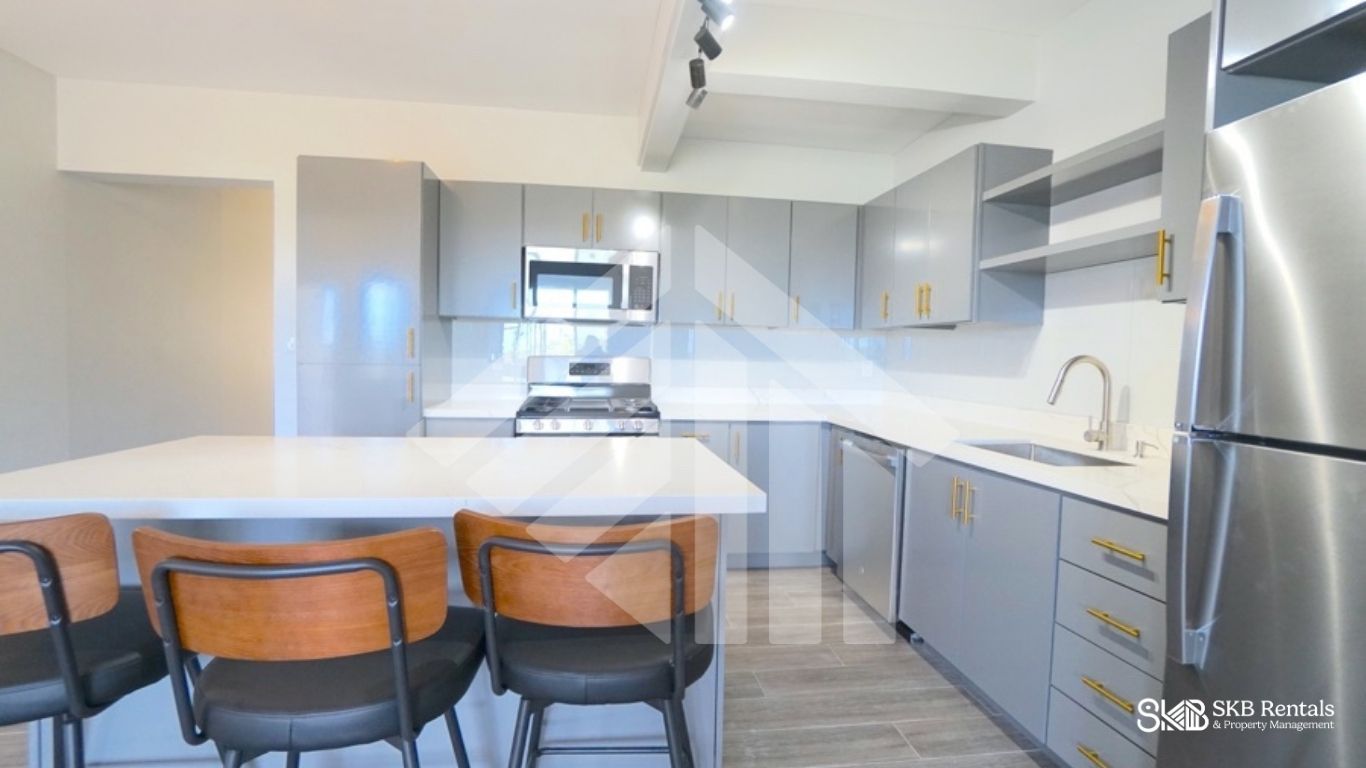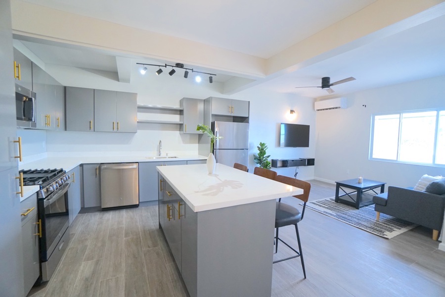 The entrance opens into a bright, spacious air conditioned open-plan living area featuring comfortable sofa seating and a stylish, well-appointed kitchen with ample storage and countertop space along with a large center island with seating—ideal for everyday living and entertaining. A washer and dryer are provided for added convenience.