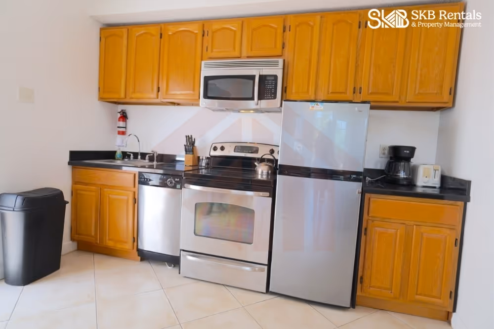 This furnished apartment is located in the heart of Frigate Bay just a few minutes walk from grocery stores, coffee shops, restaurants and the Caribbean beach.
