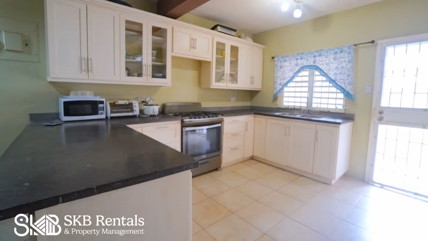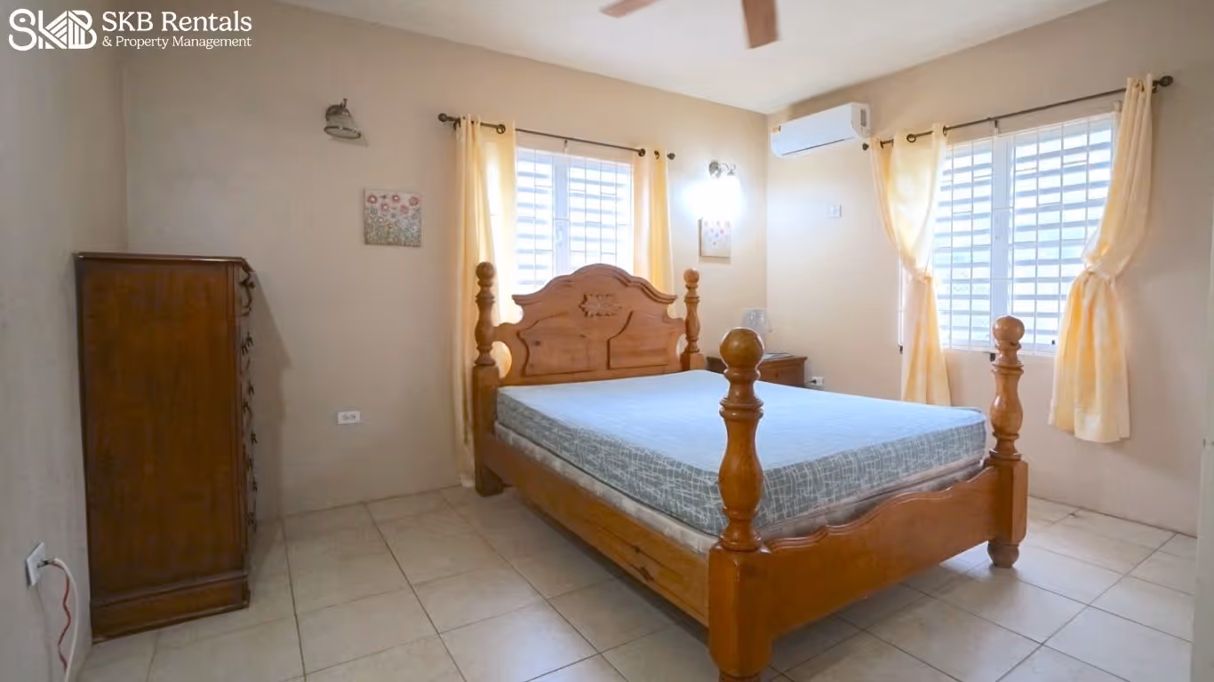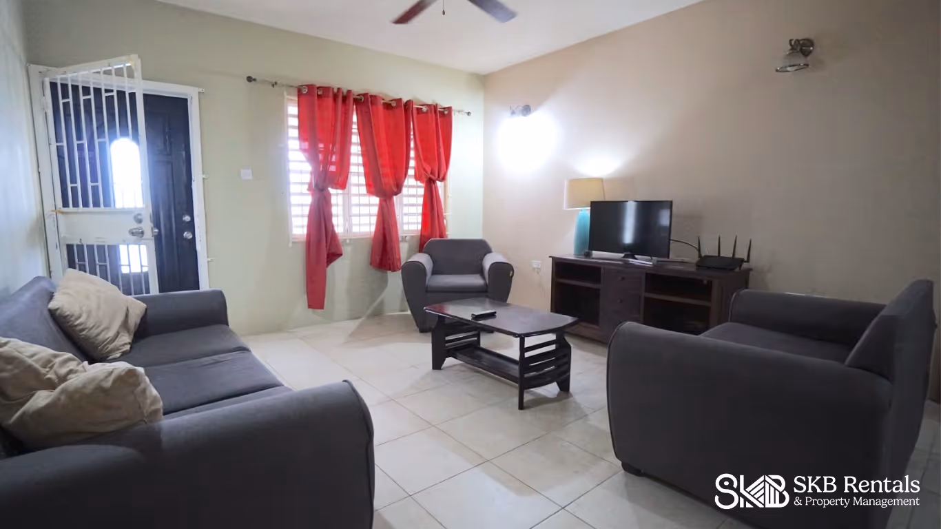 This spacious 2 bedroom apartment is offered fully furnished and move in ready. Located in St Peters, a quiet residential area just 10 minutes from Basseterre, off road parking leads to the entrance way which opens to the living, dining and large kitchen area. The kitchen is spacious with generous counter space and store and gas stove. A washer and dryer is provided and there is a line in the garden for outside drying.