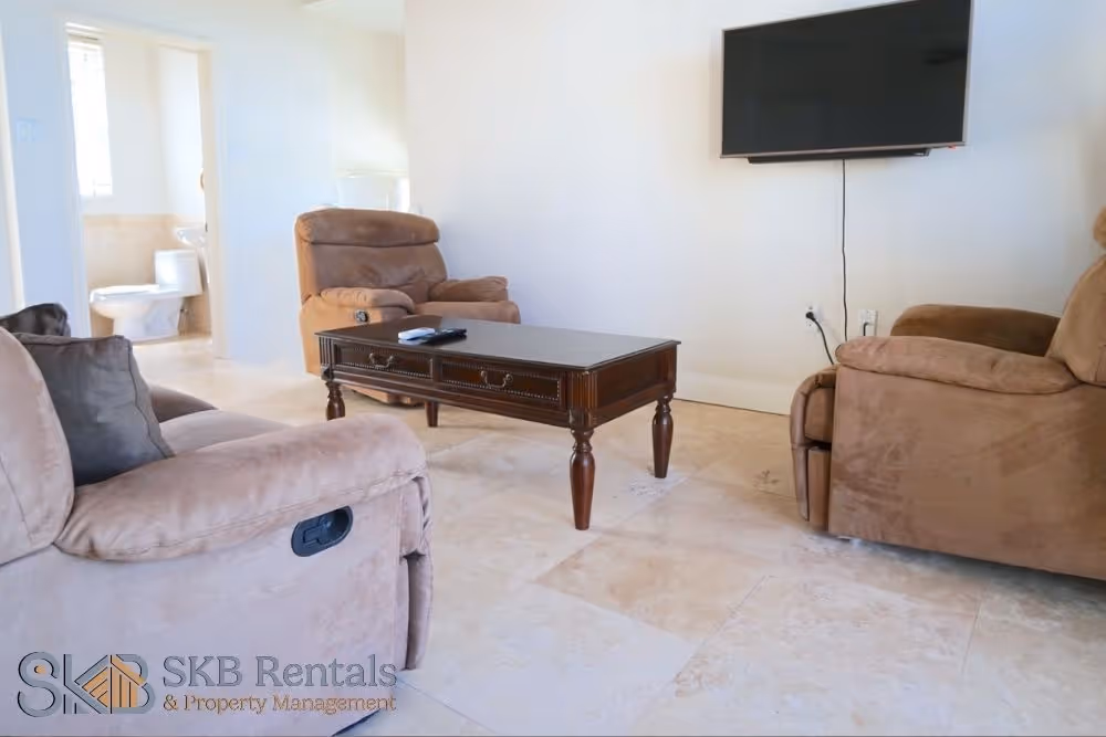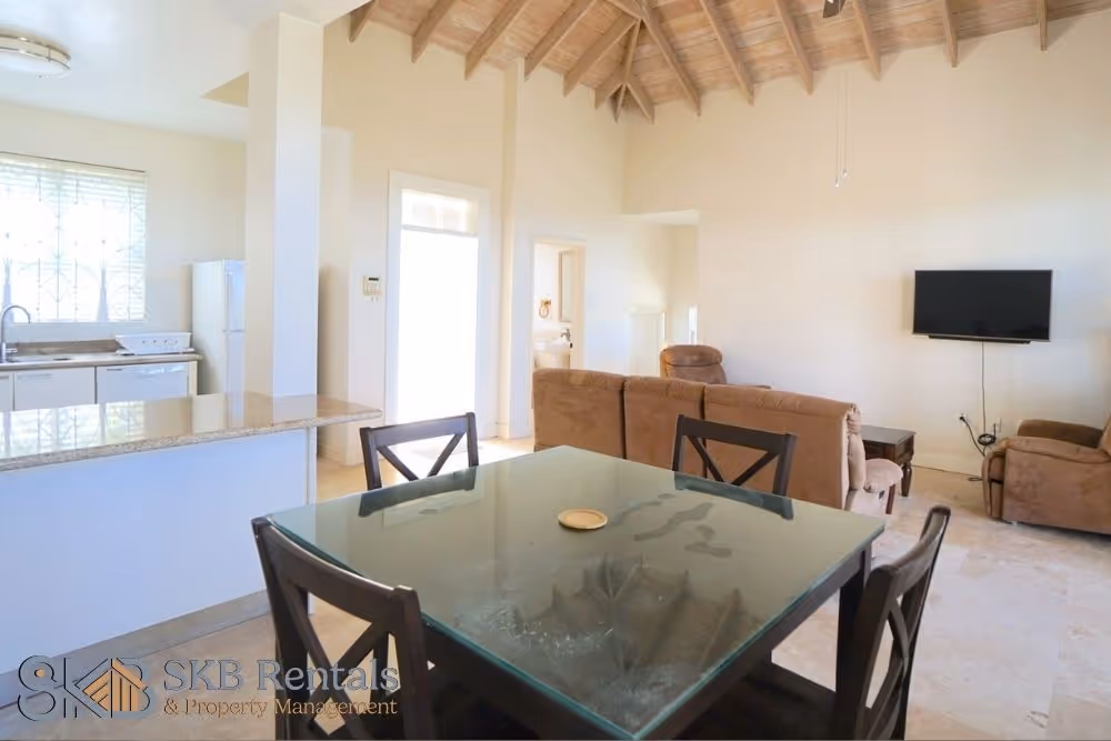 This furnished 1 bedroom unit offers off road parking and great views. The main entrance leads to the well equipped kitchen and open plan dining and living room which is air conditioned. Large french doors open onto a covered veranda and adequate windows allow for lots of natural light. A guest bath and laundry complete the upper level.