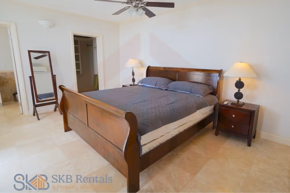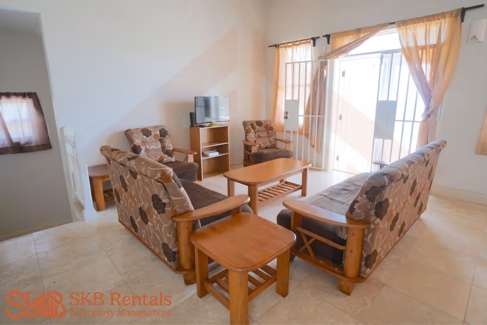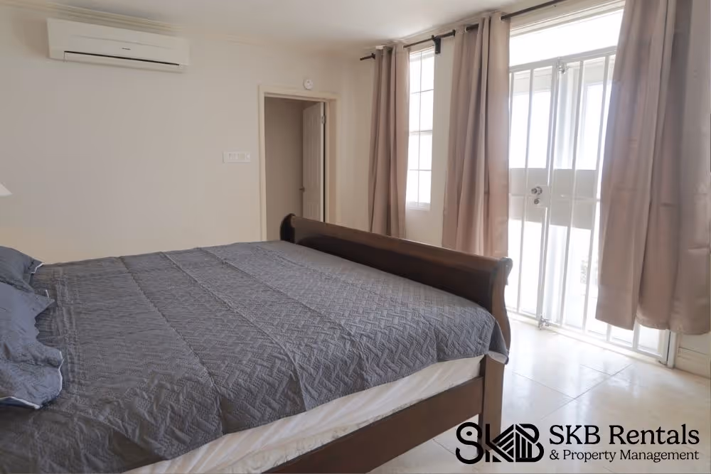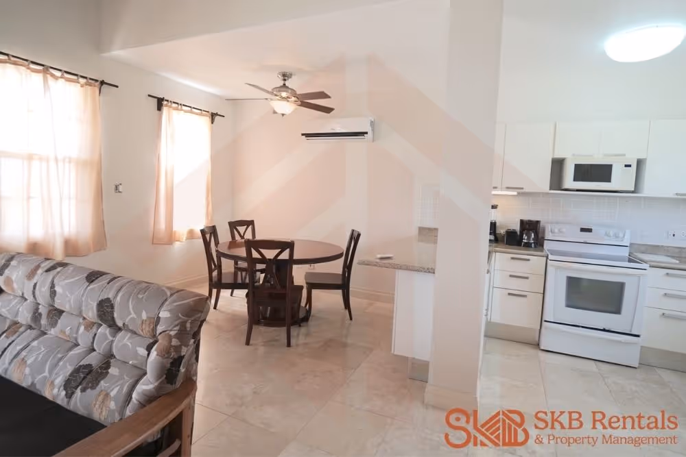 This furnished split level 1 bedroom unit offers off road parking and great views of the ocean beyond. The main entrance leads to the well equipped kitchen and open plan dining and living room. Large french doors open onto a covered veranda and adequate windows allow for lots of natural light. A guest bath and laundry complete the upper level. Air conditioning is installed on this level for your comfort.