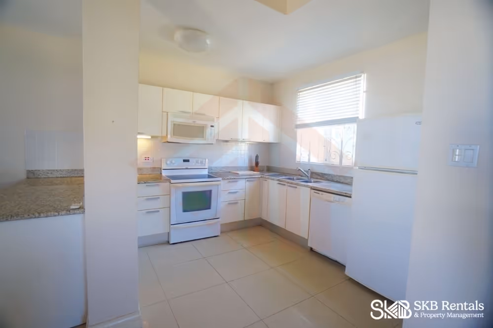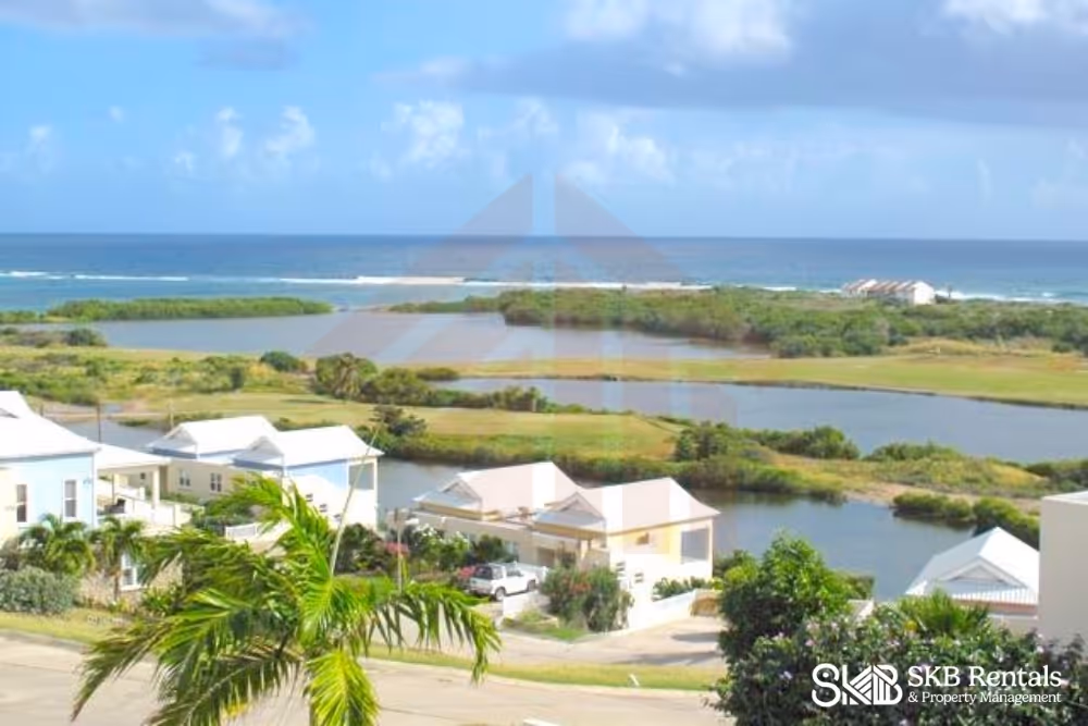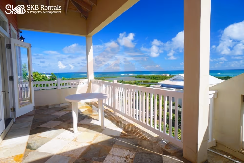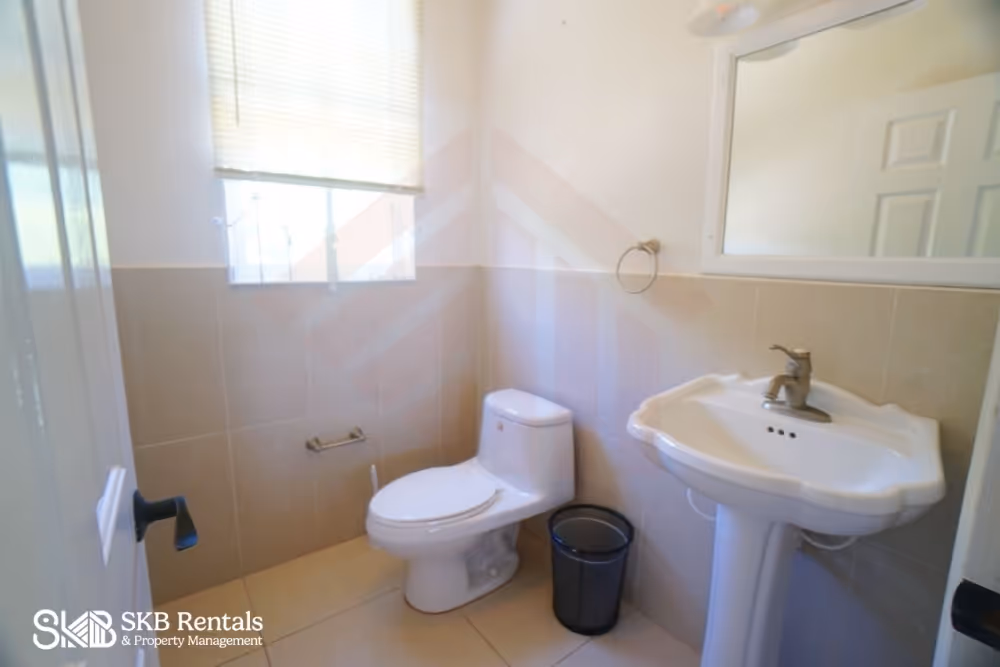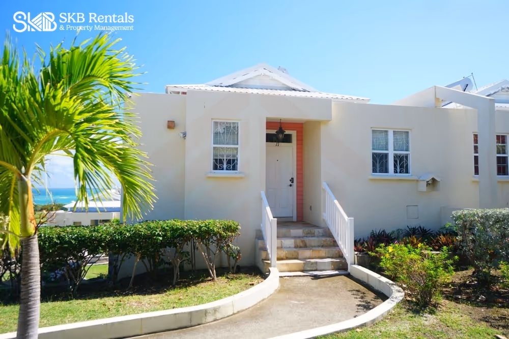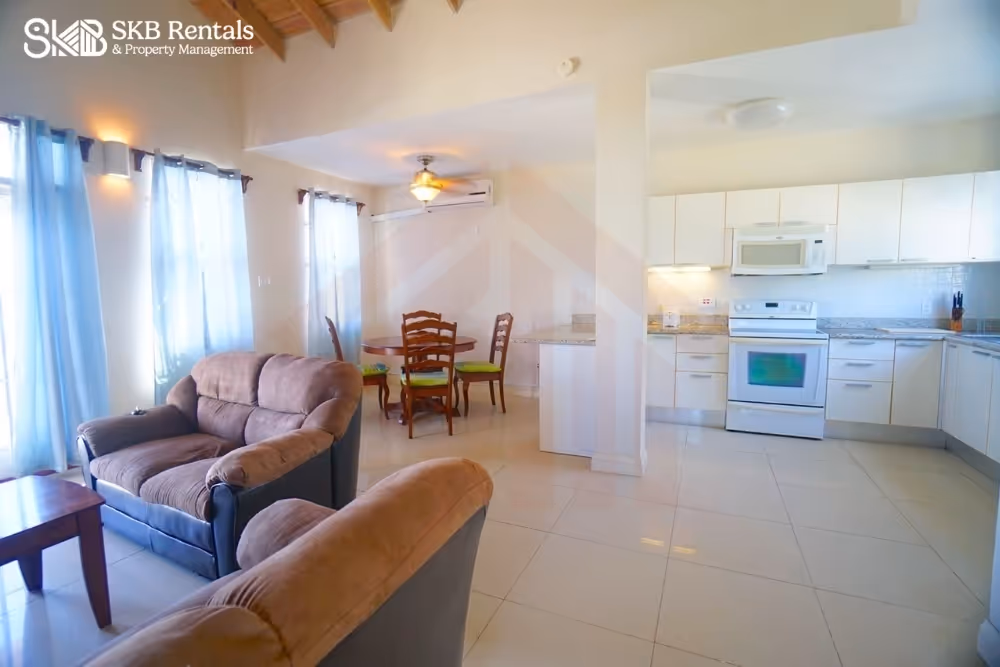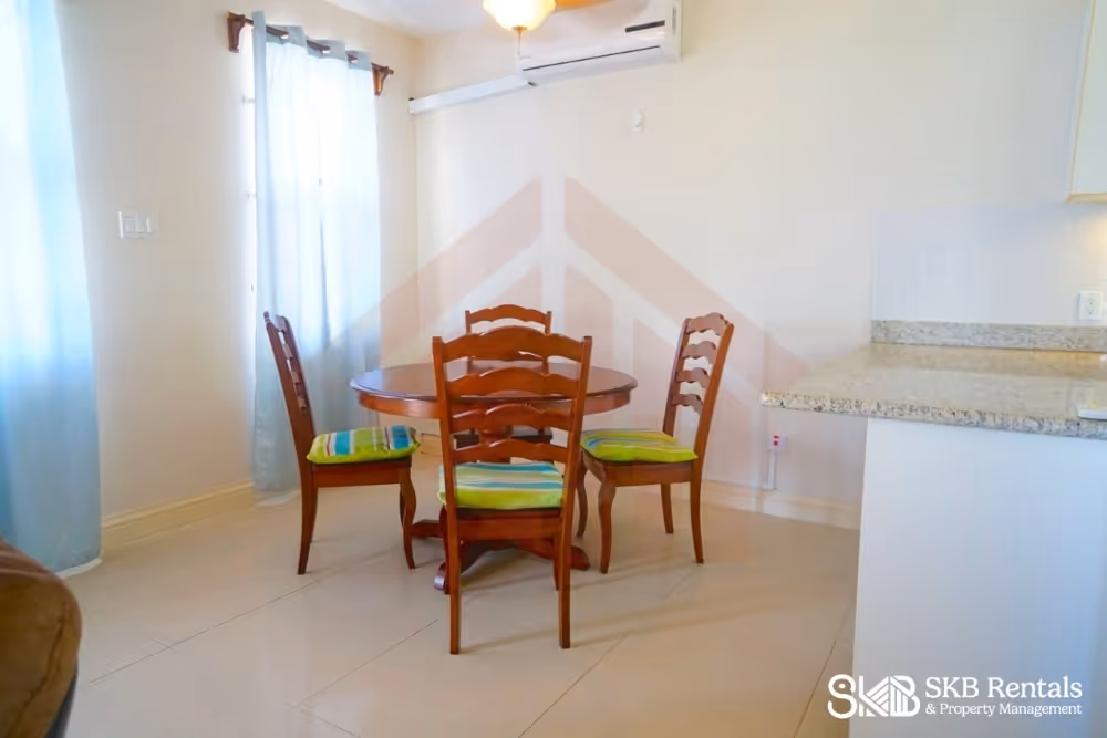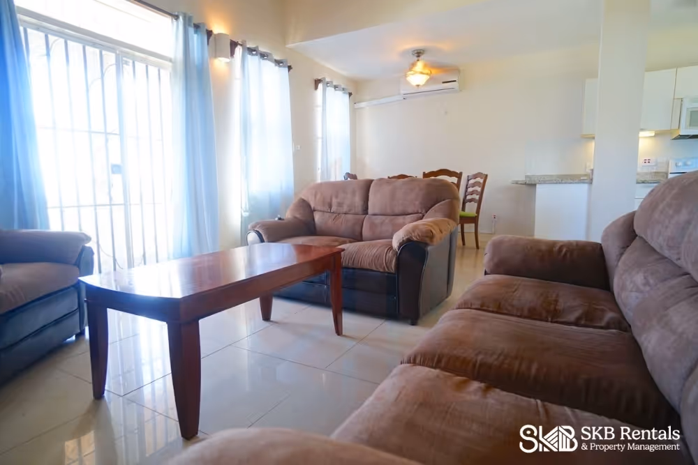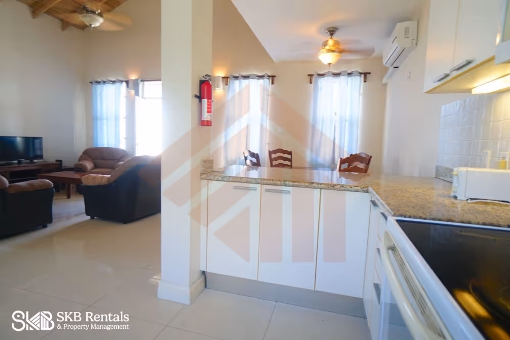 This furnished duplex unit at Sunrise Hills offers off road parking and great views of the ocean beyond. The main entrance leads to the well equipped kitchen with granite countertops and generous storage and opens into the dining and living room which is airconditioned. Large french doors open onto a covered veranda and adequate windows allow for lots of natural light. A guest bath and laundry complete the upper level.