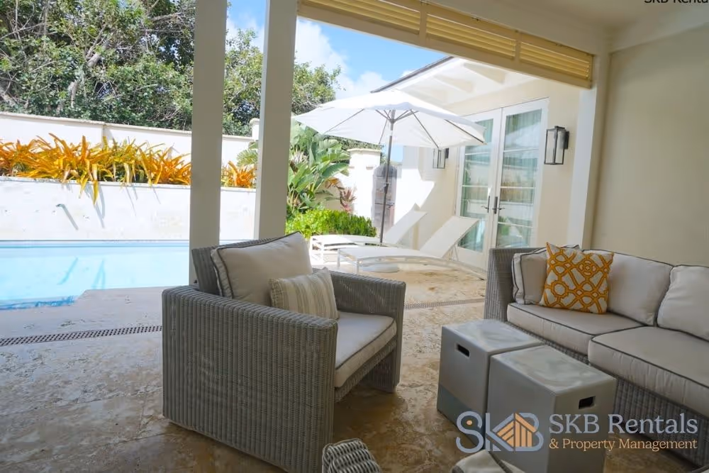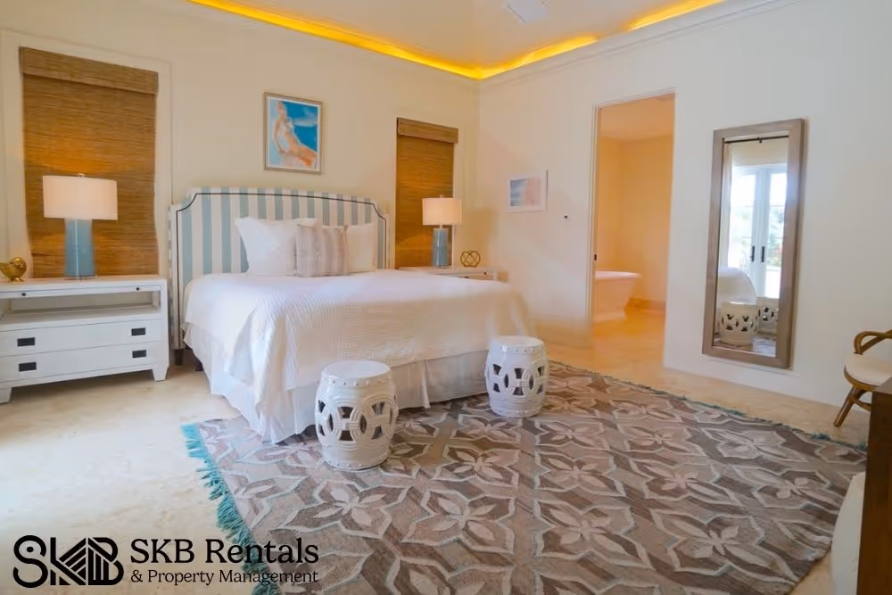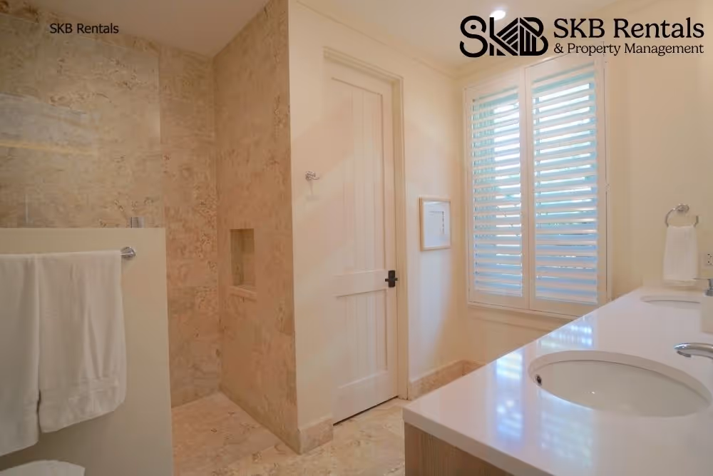 There are four bedrooms with a bed configuration of a master suite comprising of a kingsized bed sleeping 2 persons and ensuite bathroom with stand alone tub and walk in shower, double vanity and toilet and a 2 queen bed suite sleeping up to 4 persons with ensuite bathroom with tub and shower, vanity and toilet located on each side of the villa. A guest toilet also opens to the pool deck. The villa is equipped with extra sheets and generous supplies of towels.